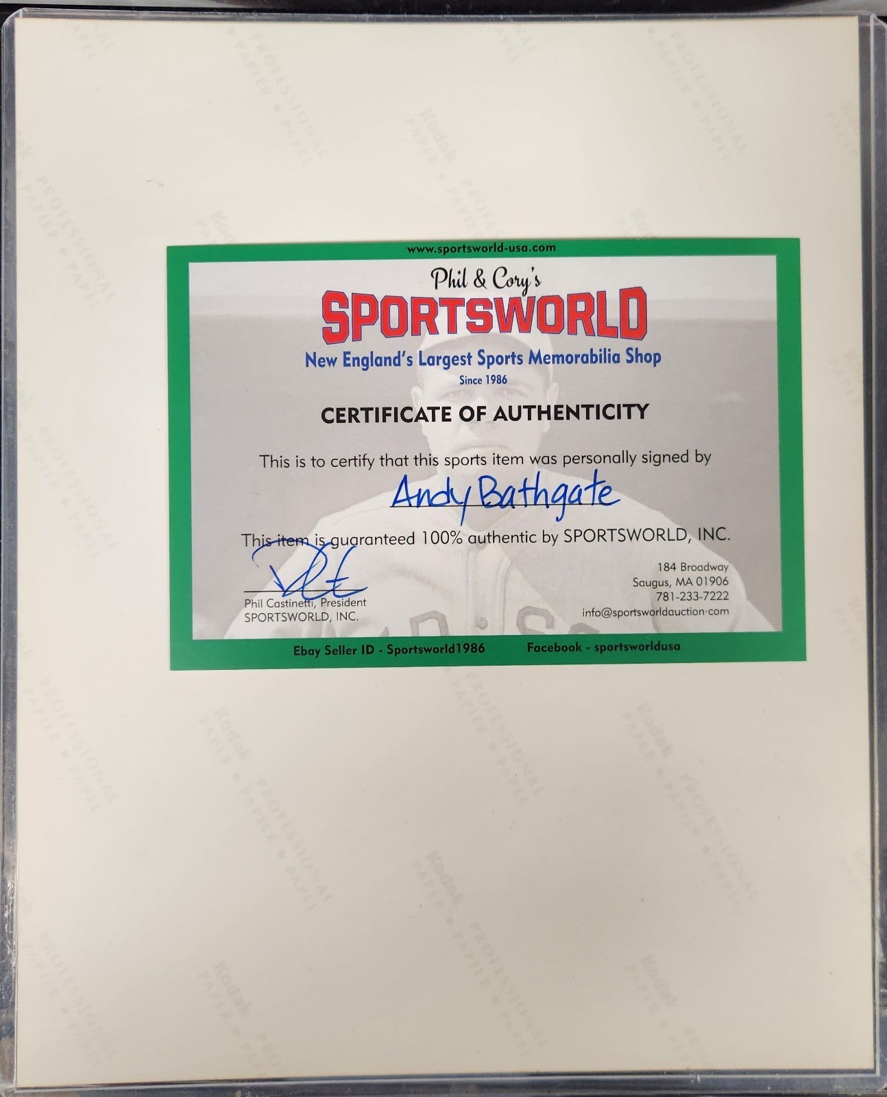 The COA is from Sportsworld- New England's largest sports memorabilia shop. Please refer to our pictures to be sure.