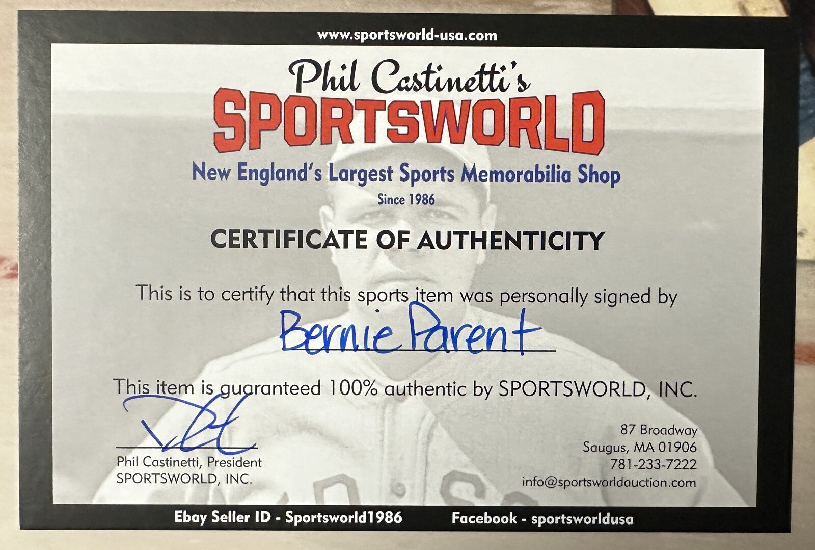 We're offering this 16x20 Photo Autographed by Hockey Hall of Fame Goalie Bernie Parent of the Boston Bruins. It comes with a COA issued by Sportsworld New England's Largest Sports Memorabilia Store and his signature is guaranteed to be 100% authentic. The photo is in nm condition.