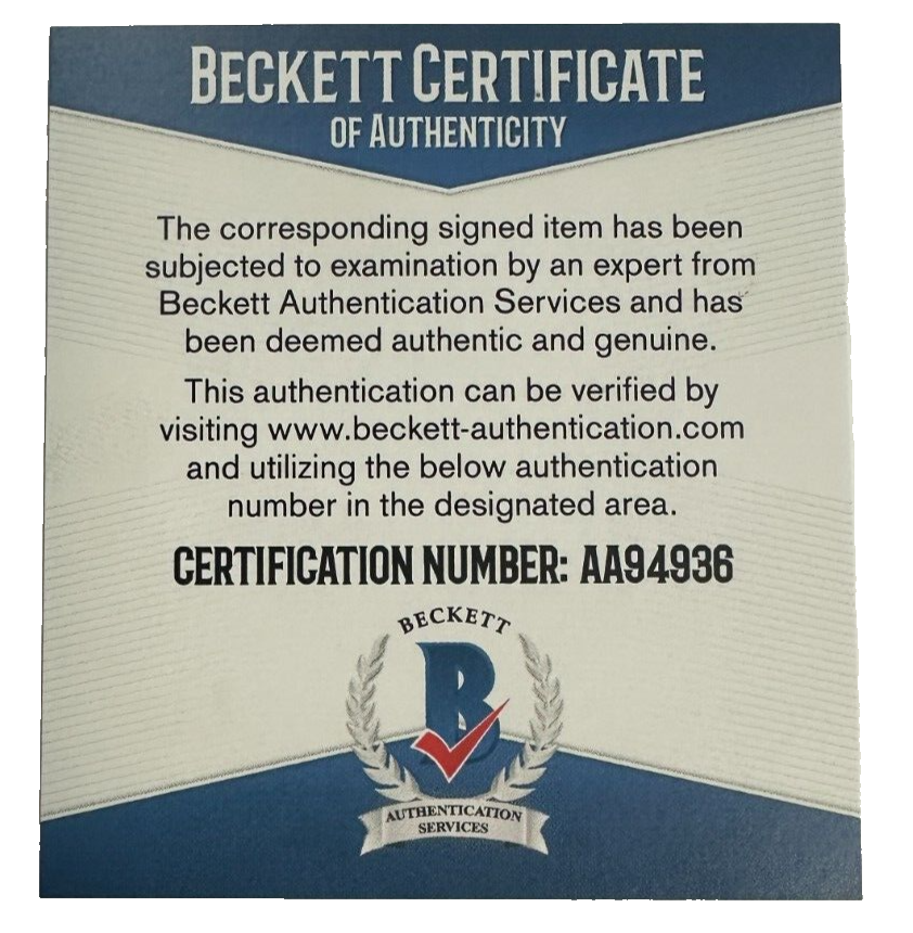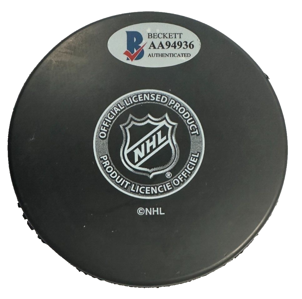 We're offering this Official Toronto Maple leafs Hockey Puck Autographed by former star Bill Ezinicki. It's in nm condition and it comes with a COA & Matching Hologram Issued by BAS Beckett Authentication Services and his signature is guaranteed to be 100% authentic. We do have multiples of this puck signed by Bill, so the puck you receive might not be the exact puck in the photo. The puck will be shipped in a plastic display square.