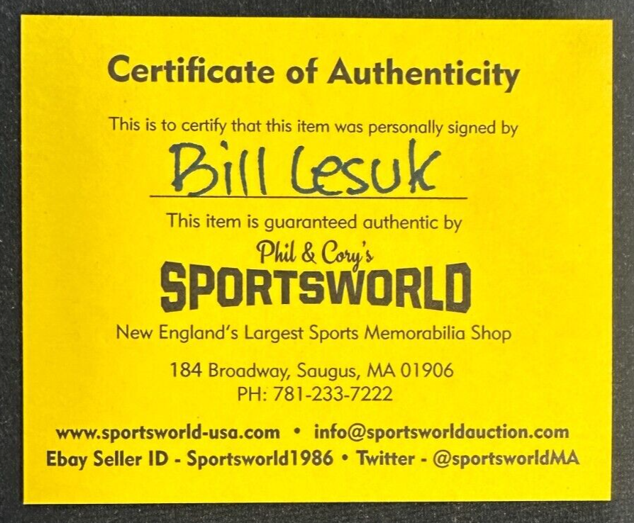 We're offering this Official Los Angeles Kings Hockey Puck Autographed by former star Bill LesukIt's in nm condition and it comes with a COA Issued by Sportsworld, New England's Largest Sports Memorabilia Store and his signature is guaranteed to be 100% authentic.  We do have multiples of this puck signed by Bill, so the puck you receive might not be the exact puck in the photo. The puck will be shipped in a plastic display square.