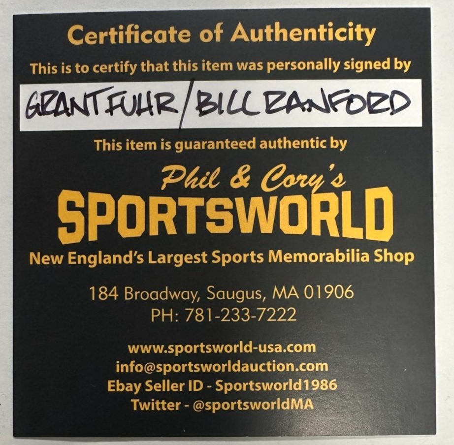 We're offering this Edmonton Oilers Hockey Puck Autographed by Hall of Fame Goalie Grant Fuhr as well as All-Star Goalie Bill Ranford.It's in nm condition and it comes with a COA Issued by Sportsworld, New England's Largest Sports Memorabilia Store and his signature is guaranteed to be 100% authentic. The puck will be shipped in a plastic display square. We will combine on shipping for similar items!