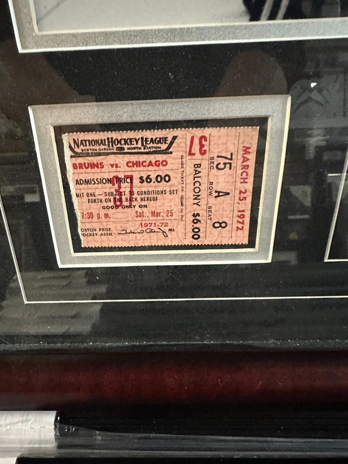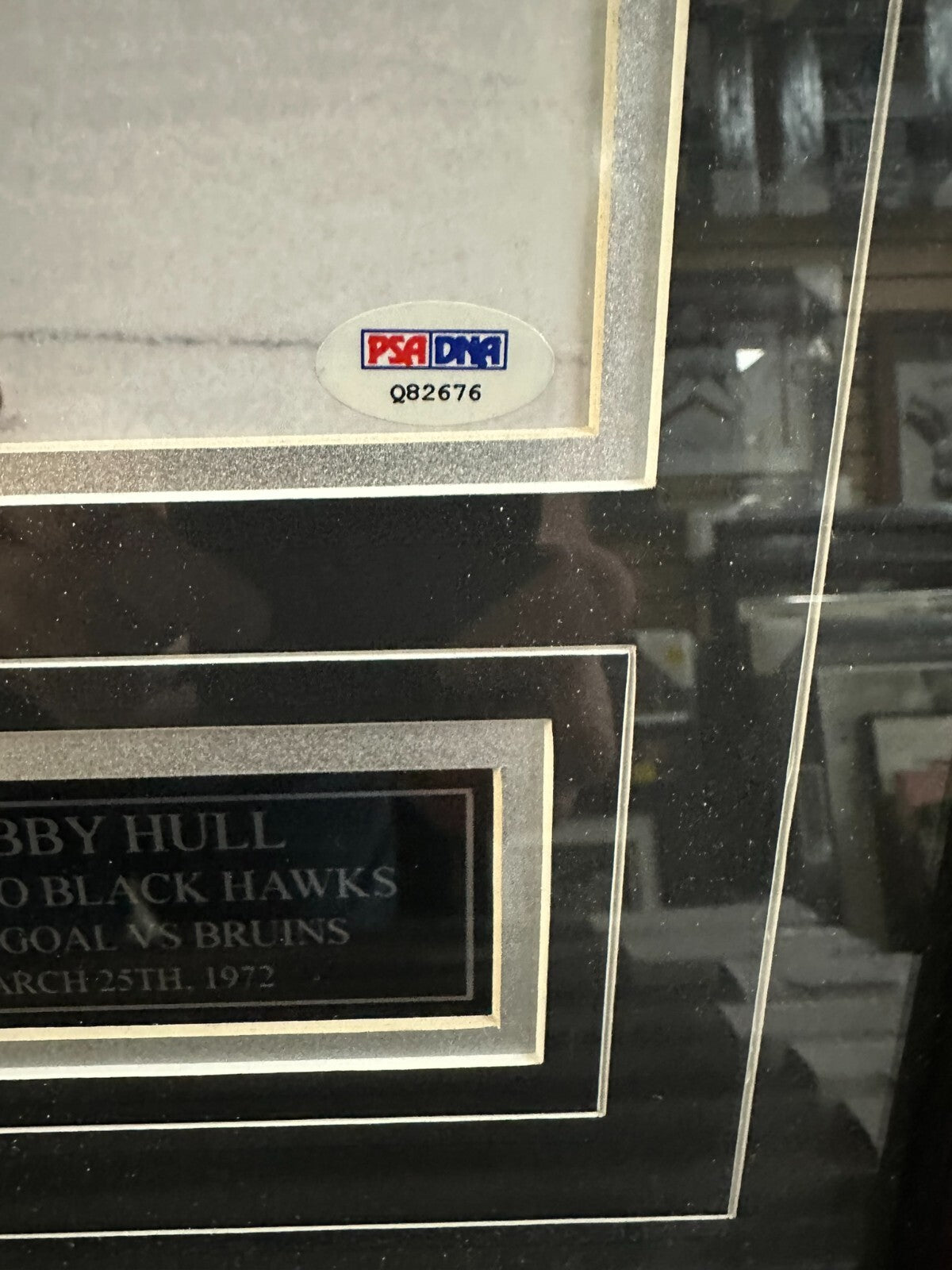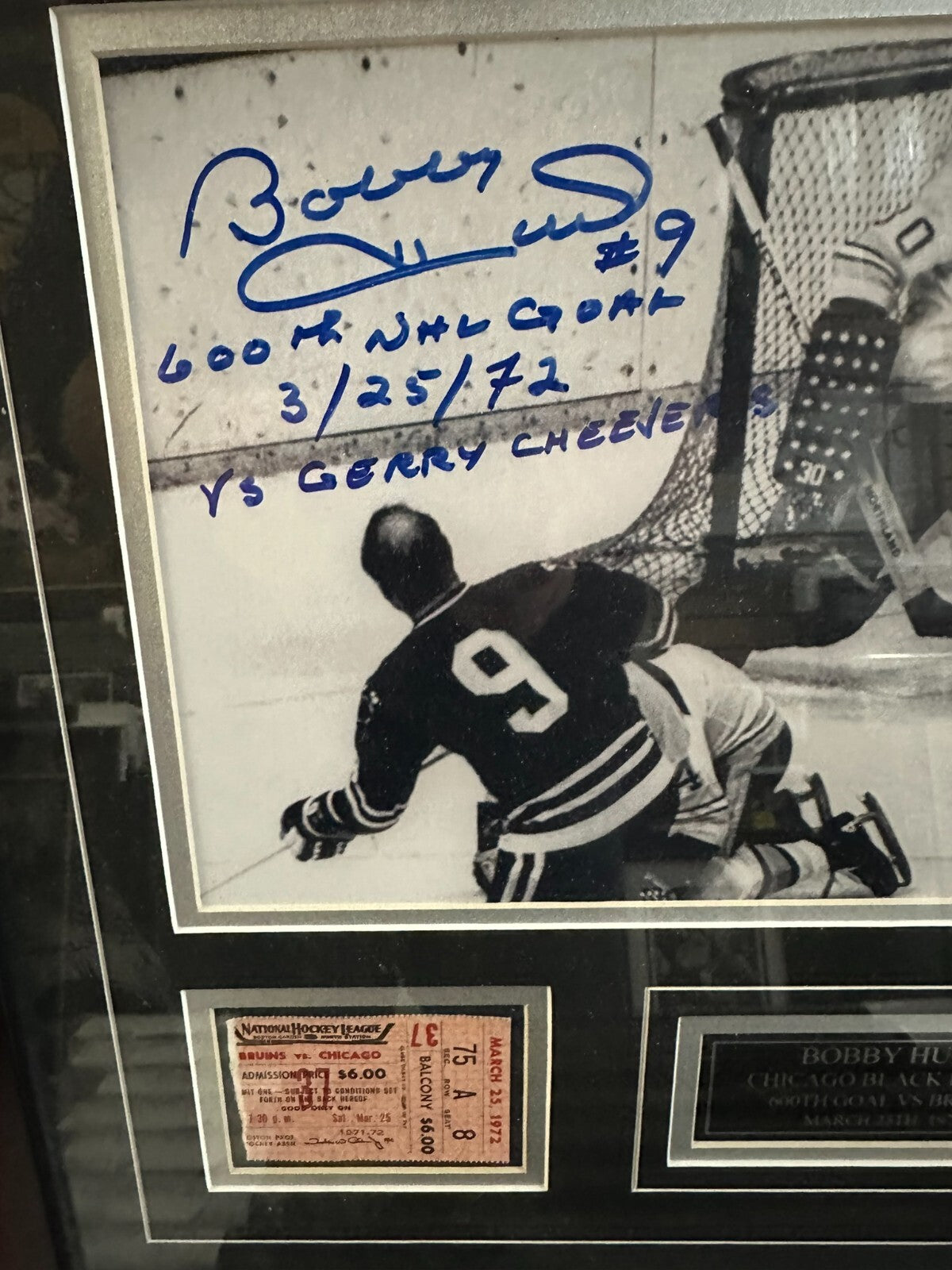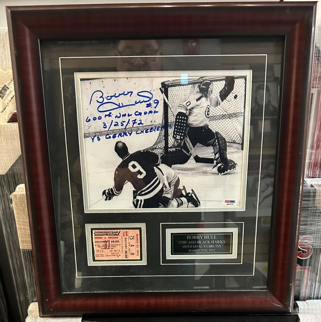 We're offering this 8x10 photo of Hockey Hall of Famer Bobby Hull scoring his 600th career goal off of Gerry Cheevers of the Boston Bruins. The photo has been autographed and inscribed with "600th NHL Goal 3/25/72 Vs. Gerry Cheevers" by Bobby. It's beautifully matted & framed along with a nameplate as well as an authentic ticket from the game at the Boston Garden. It comes with a hologram issued by PSA/DNA Professional Sports Authenticator (Q82676) and his signature is guaranteed to be 100% authentic.
