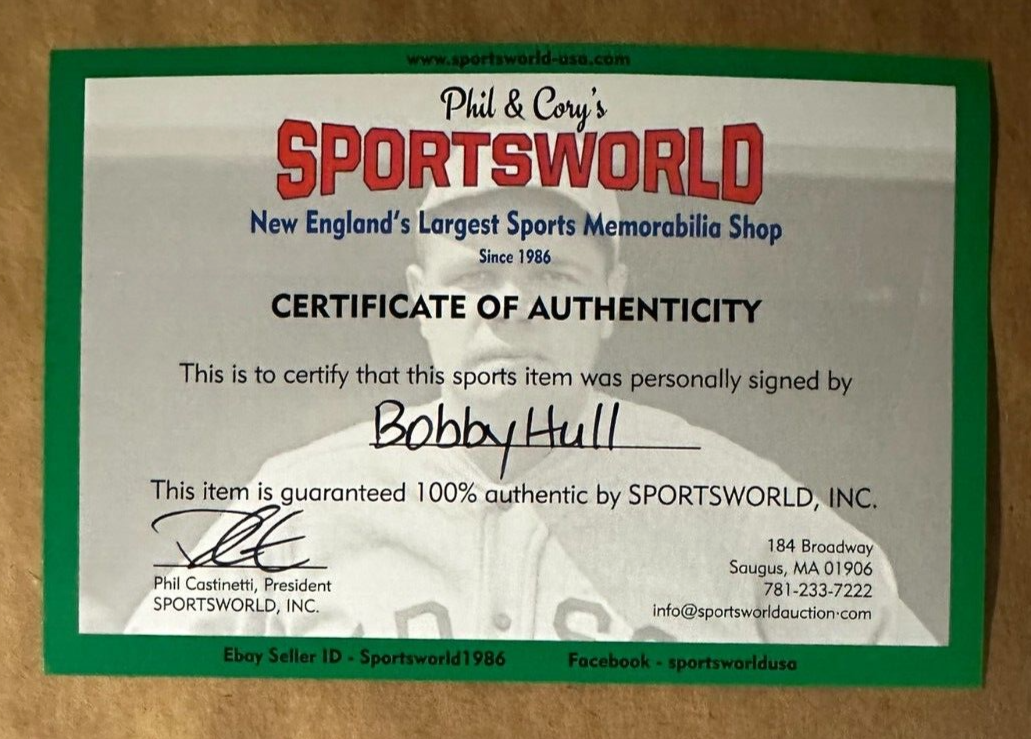 We're offering this 16x20 photo Autographed and inscribed with "The Golden Jet" by Hockey Hall of Famer Bobby Hull of the Chicago Blackhawks. It's beautifully matted & framed. It comes with a COA issued by Sportsworld, New England's Largest Sports Memorabilia Store and his signature is guaranteed to be 100% authentic.