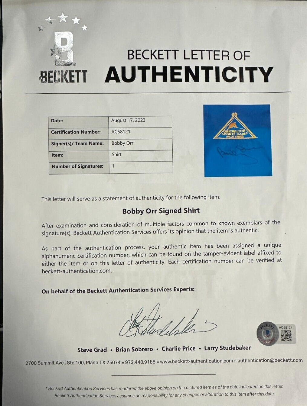 We're offering this Staff Shirt from the Bobby Orr & Mike Walton Sports Camp in Orilla, Canada Autographed on the front by Hockey Hall of Famer Bobby Orr of the Boston Bruins. It's in ex condition and comes with a Full Letter LOA & Matching Hologram issued by BAS (AC58121) Beckett Authentication Services and his signature is guaranteed to be 100% authentic, and we will combine on shipping for similar items!