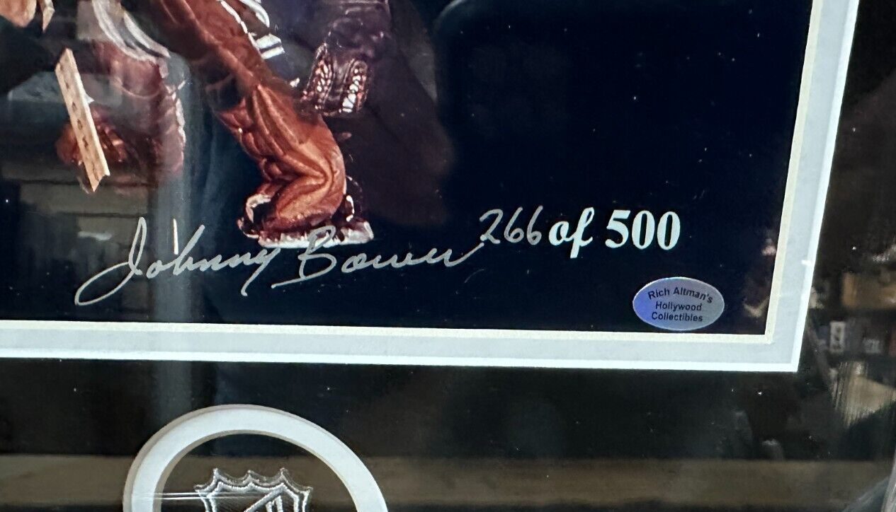 We're offering this Autographed 16x20 Photo of the Original Six teams of Hockey & Their Goalies. Autographed by Hockey Hall of Famers Johnny Bower of the Maple Leafs, Glenn Hall of the Blackhawks, Gump Worsley & Chuck Rayner of the Rangers as well as Gerry McNeil of the Canadiens, Charlie Hodge of the Canadiens, Denis DeJordy of the Blackhawks, Eddie Johnston of the Bruins, Cesare Maniago of the North Stars & Sugar Jim Henry of the Bruins. It's beautifully matted & framed, and it comes with a Hologram Issued by Rich Atlman's Hollywood Collectibles and all of the signatures are guaranteed to be 100% Authentic. The entire photo measures approx. 20" x 24". We will combine on shipping for similar items!