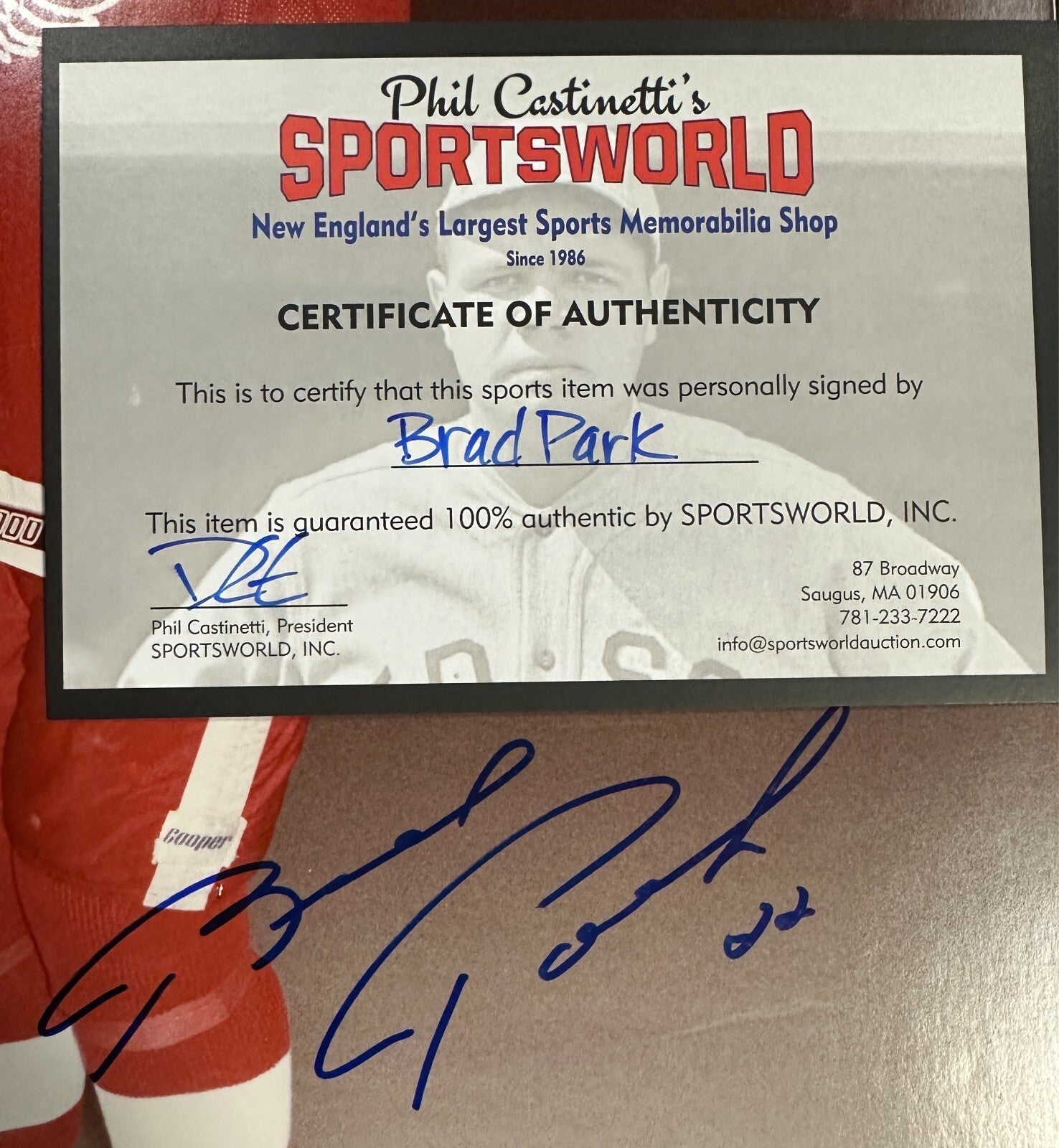 We're offering this 11x14 Photo Autographed by Hockey Hall of Famer Brad Park of the Detroit Red Wings. It comes with a COA issued by Sportsworld, New England's Largest Sports Memorabilia and his signature is guaranteed to be 100% authentic.