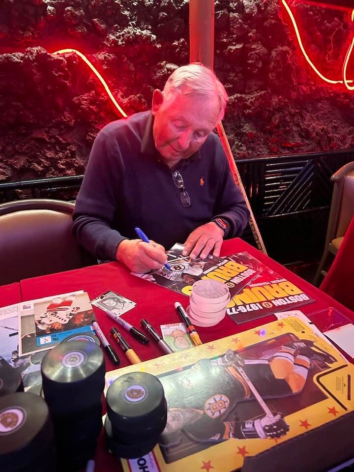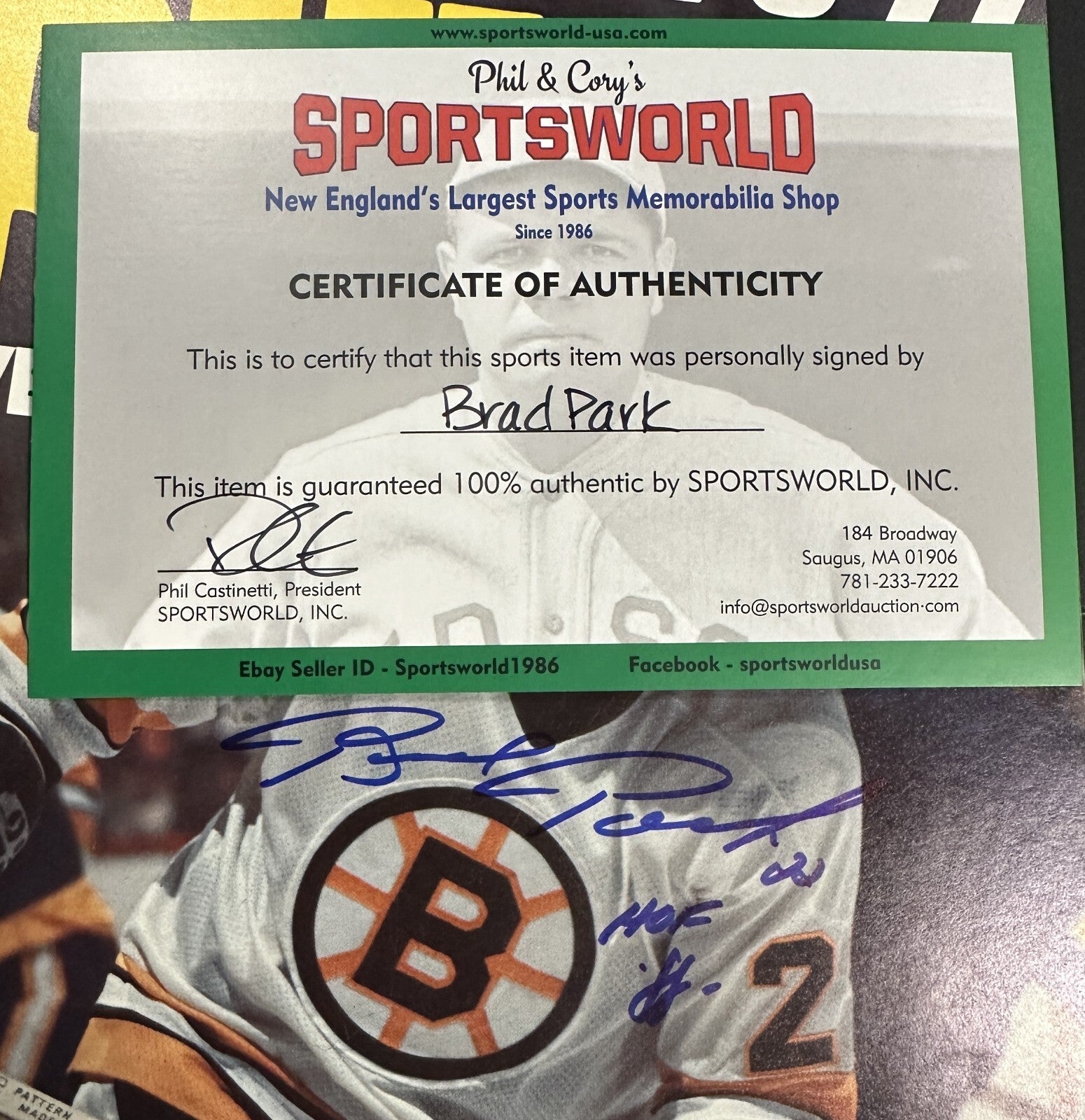We're offering this 1976-77 Boston Bruins Yearbook Autographed on the cover by Hockey Hall of Famers Brad Park & Gerry Cheevers of the Boston Bruins. It's in ex condition; it comes with a COA Issued by Sportsworld, New England's Largest Sports Memorabilia Store and his signature is guaranteed to be 100% authentic. We will combine on shipping for similar items!