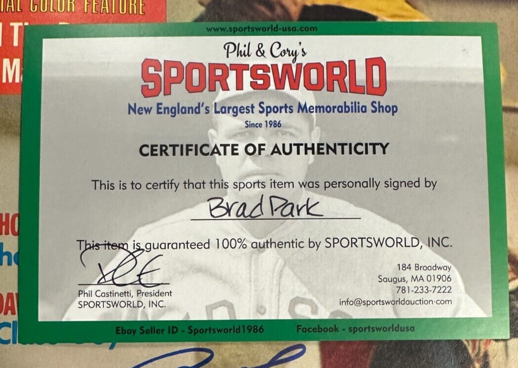 We're offering this April 1971 Issue of Hockey Illustrated Autographed & Inscribed with "HOF 88" on the cover by Hockey Hall of Famer Brad Park New York Rangers. It's in ex condition; it comes with a COA issued by Sportsworld, New England's Largest Sports Memorabilia Store and his signature is guaranteed to be 100% authentic. We will combine on shipping for similar items!