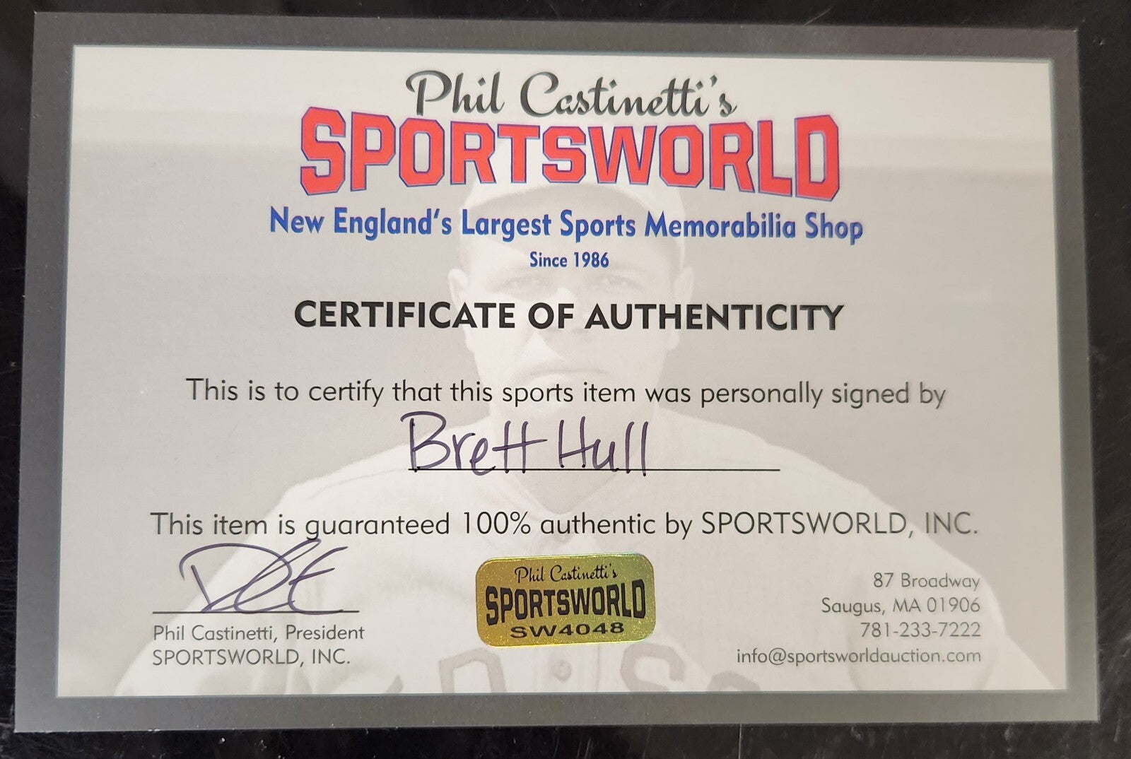 The COA is from Sportsworld- New England's largest sports memorabilia shop. Please refer to our pictures to be sure.