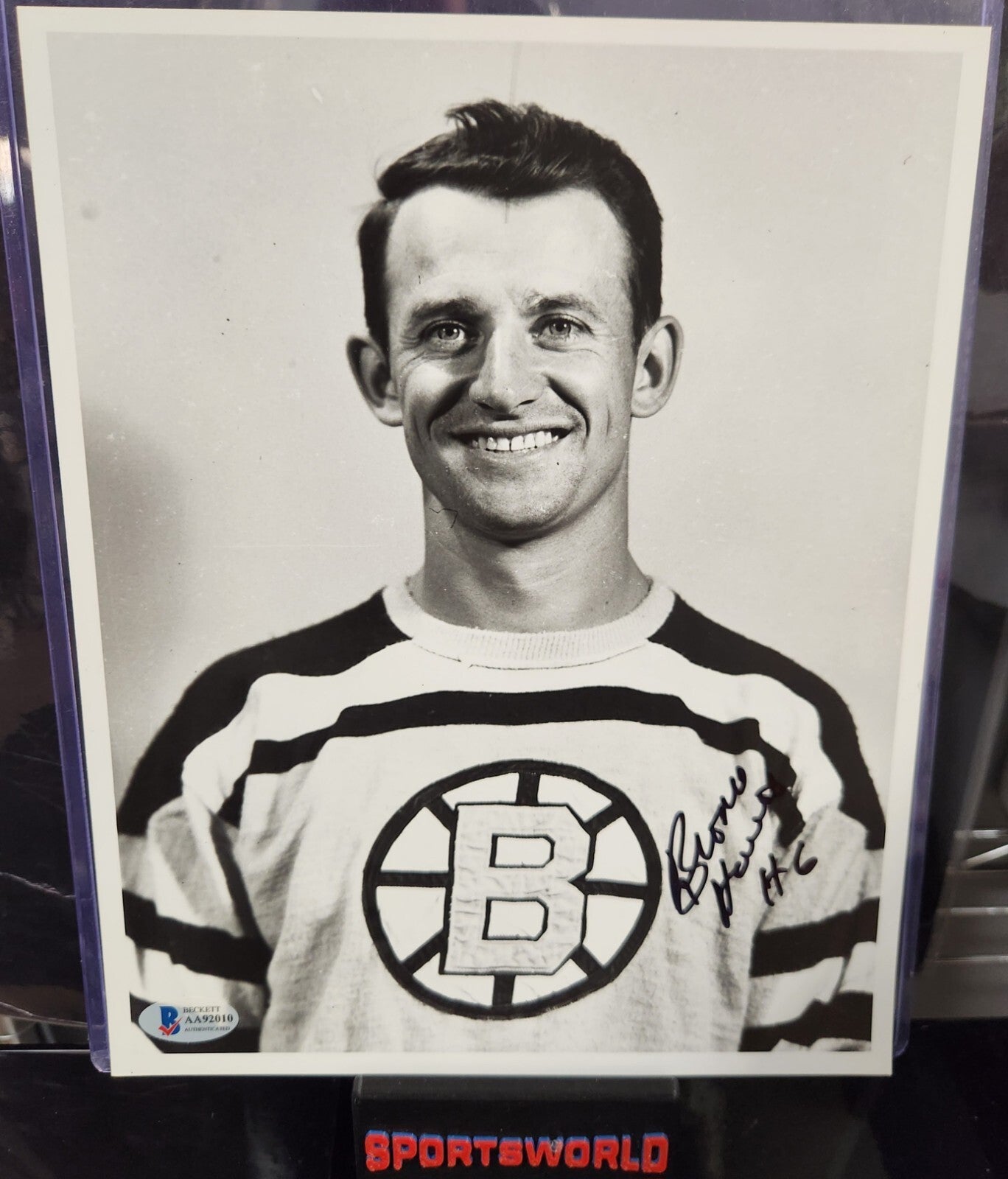 This piece would make a great addition to any collection, or a perfect gift for a Bruins fan. It captures a moment in time that will never be forgotten. Whether you're a die-hard hockey fan or just looking for a unique piece of sports memorabilia, this Bronco Horvath signed photo is a great choice.