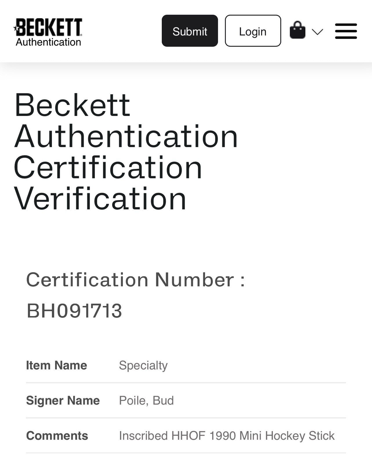 Bud Poile HOF 1980 Signed Mini Stick Beckett Toronto Maple Leafs