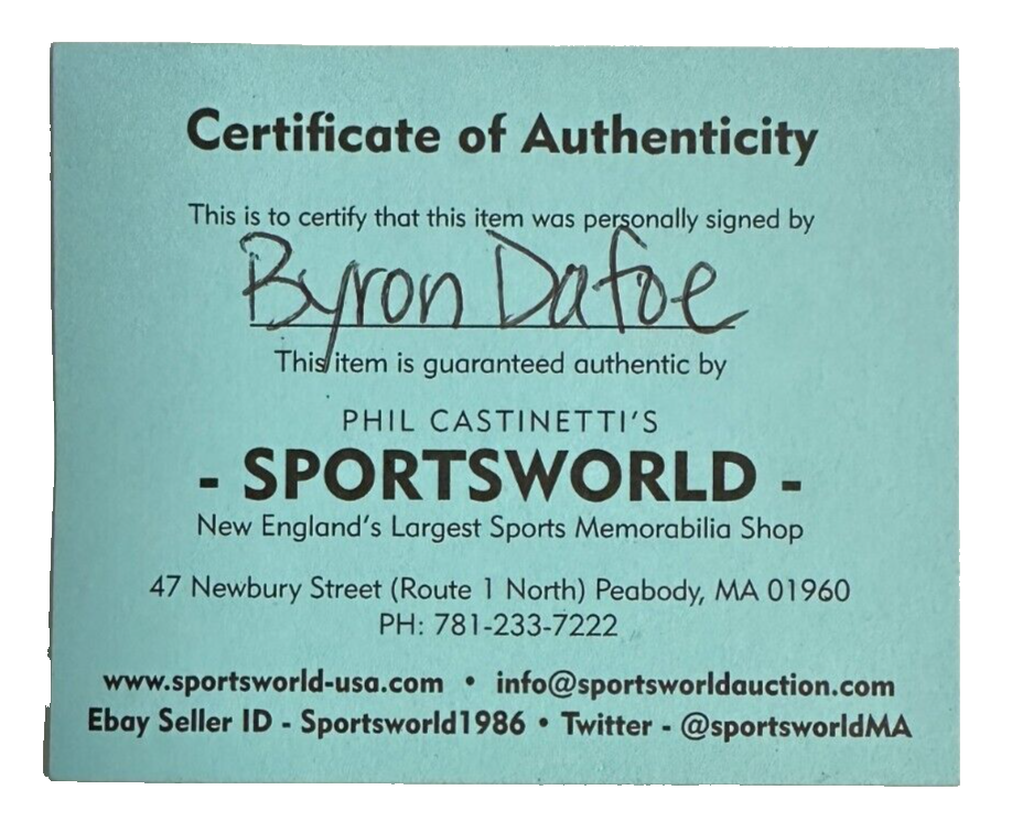 We're offering this Official Boston Bruins Hockey Puck Autographed by former Goalie Byron Dafoe. It's in nm condition and comes with a COA Issued by Sportsworld, New England's Largest Sports Memorabilia Store and his signature is guaranteed to be 100% authentic. We do have multiples of this puck signed by Byron, so the puck you receive might not be the exact puck in the photo. The puck will be shipped in a plastic display square. We will combine on shipping for similar items!