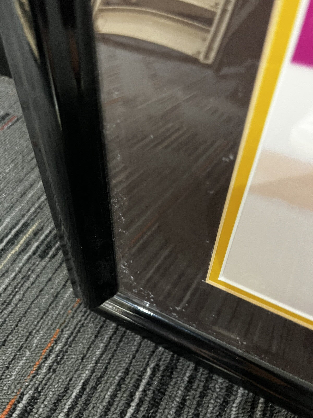 There is some whiting/marking underneath the glass on the corners of the frame. The blemishes are on the colored border.