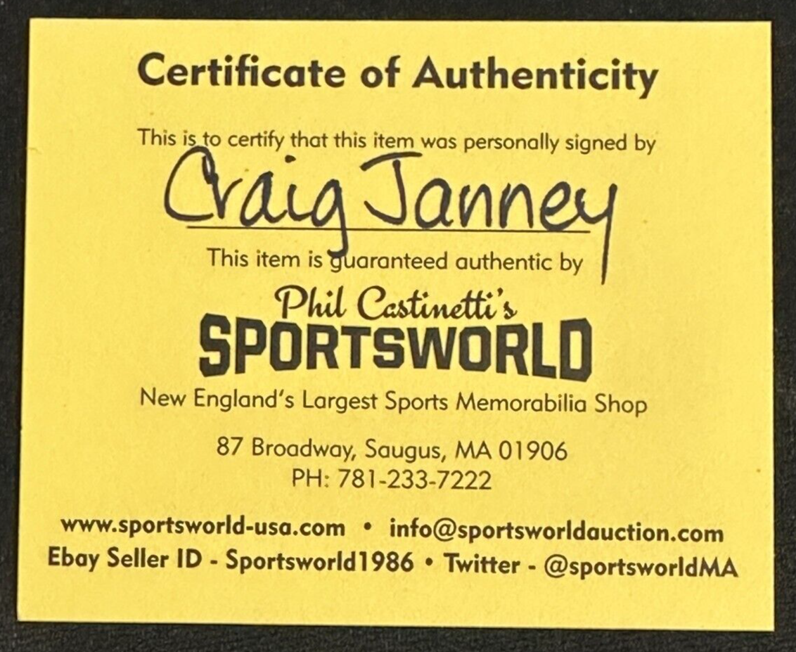 We're offering this Boston Bruins Hockey Puck Autographed by former Star Craig Janney. It's in nm condition and comes with a COA issued by Sportsworld, New England's Largest Sports Memorabilia Store and his signature is guaranteed to be 100% authentic. We do have multiple picks signed by Craig so the puck that you receive might not be the exact puck in the photo. The puck will be shipped in a plastic display square, and we will combine shipping on similar items.
