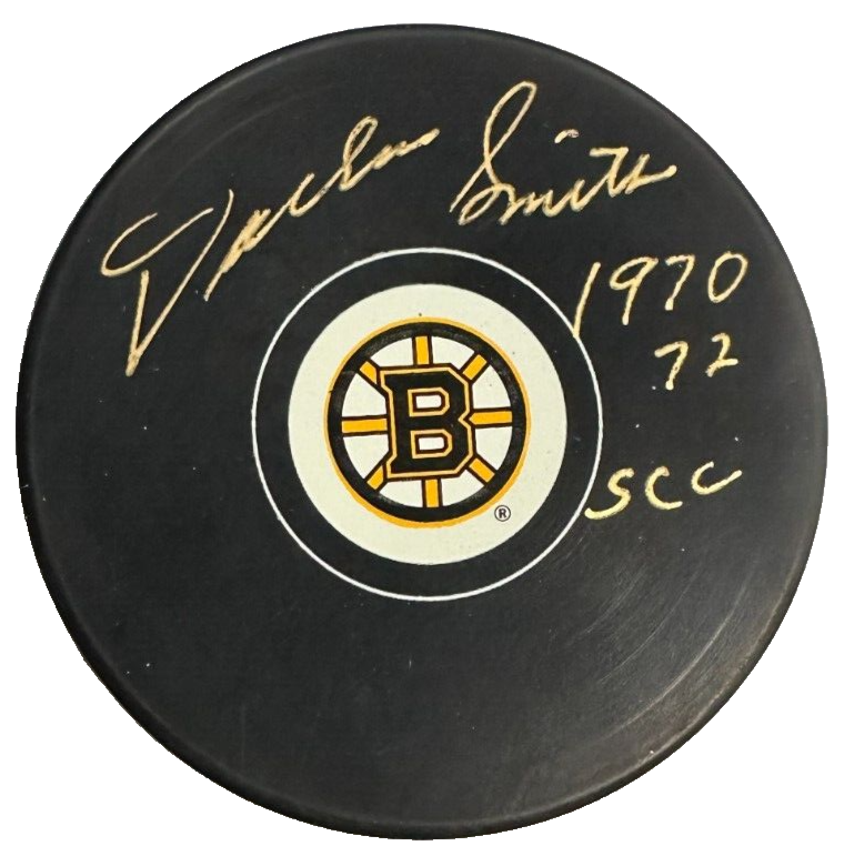Dallas Smith Autographed Boston Bruins Hockey Puck W/ 1970-72 SCC Insc