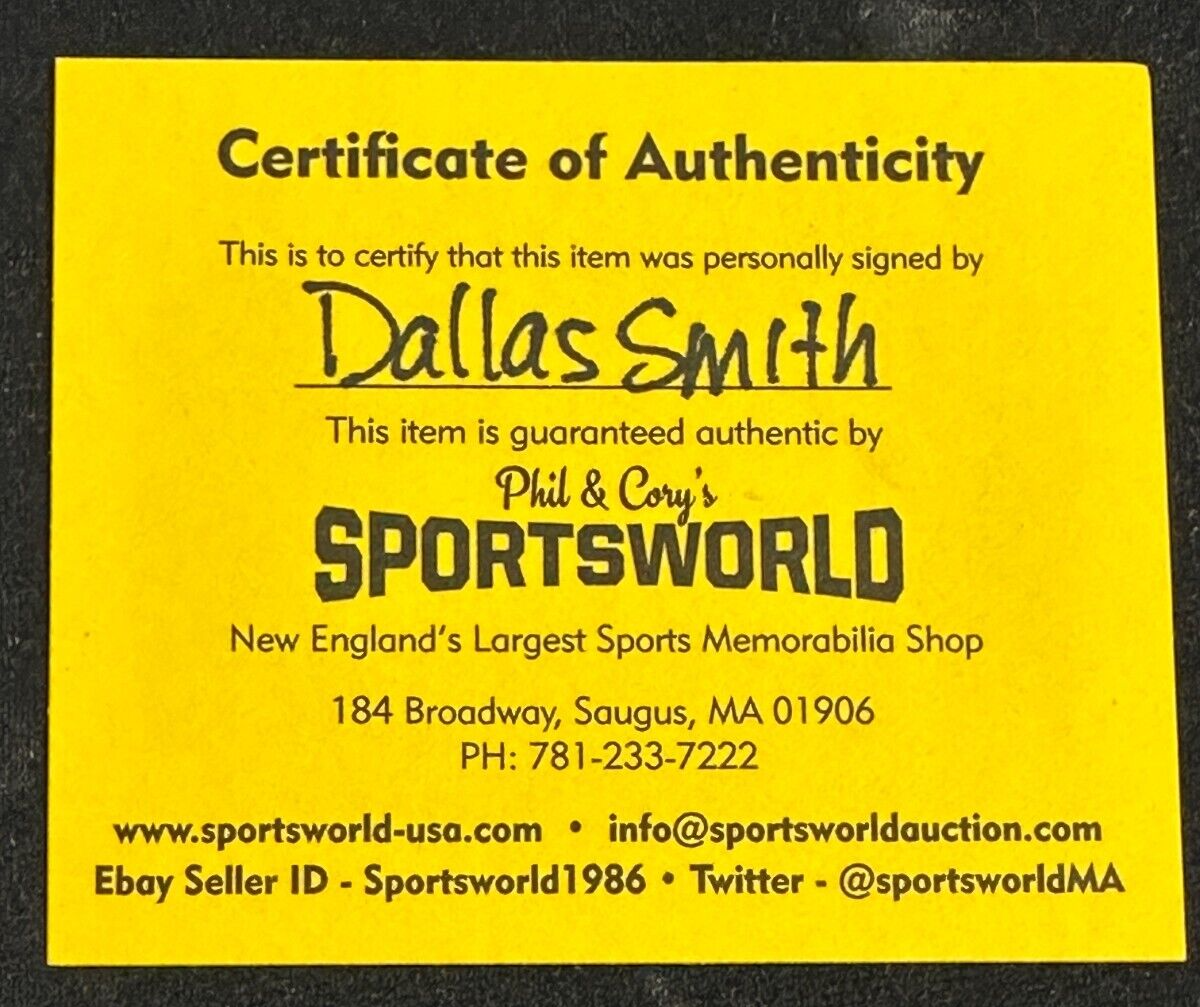 We're offering this New York Rangers Hockey Puck Autographed by former Star Defenseman Dallas Smith. It's in nm condition and comes with a COA issued by Sportsworld, New England's Largest Sports Memorabilia Store and his signature is guaranteed to be 100% authentic. We do have multiple pucks signed by Dallas so the puck you receive might not be the exact puck in the photo. The puck will be shipped in a plastic display square, and we will combine shipping on similar items.
