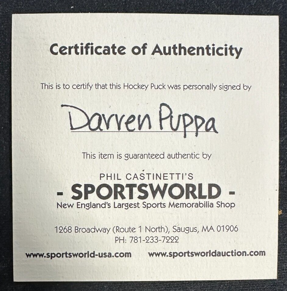 We're offering this Tampa Bay Lightning Hockey Puck Autographed by All-Star Goalie Darren Puppa. It's in nm condition and it comes with a COA Issued by Sportsworld, New England's Largest Sports Memorabilia Store and his signature is guaranteed to be 100% authentic. It will be shipped in a plastic display square, and we will combine on shipping for similar items!