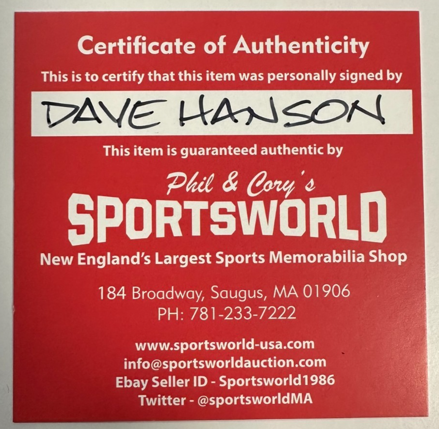 We're offering this Detroit Red Wings Hockey Puck Autographed by Dave Hanson of the classic Hockey Movie Slap Shot. Dave Played 11 games for the Red Wings during the 1978-79 NHL season. It's in nm-mt condition. It comes with a COA Issued by Sportsworld, New England's Largest Sports Memorabilia Store and his signature is guaranteed to be 100% authentic. It will be shipped in a plastic display square, and we will combine on shipping for similar items.