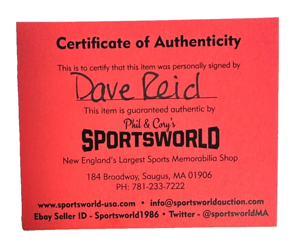 We're offering this Boston Bruins Hockey Puck Autographed by former Star Dave Reid. It's in nm condition and comes with a COA issued by Sportsworld, New England's Largest Sports Memorabilia Store and his signature is guaranteed to be 100% authentic. The puck will be shipped in a plastic display square. We will combine on shipping for similar items!