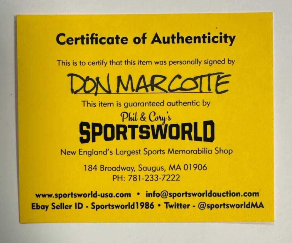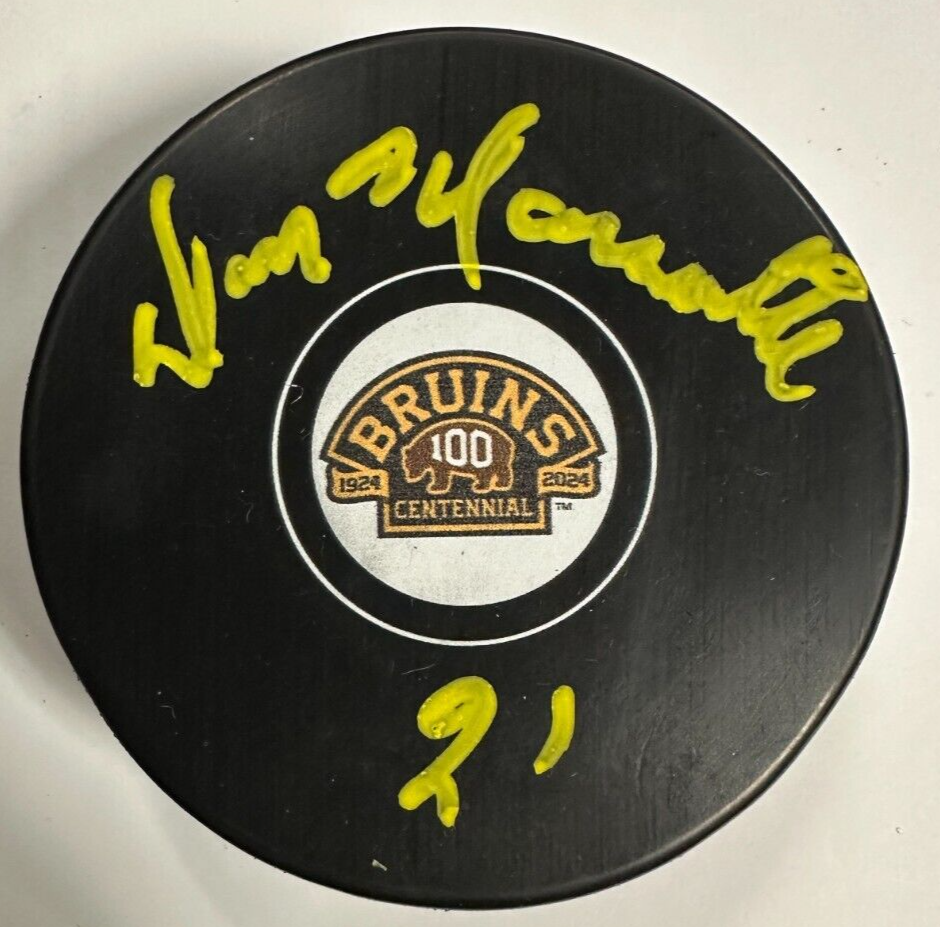 We're offering Official Boston Bruins 100th Anniversary Hockey Puck Autographed by Don Marcotte. It's in nm-mt condition and it comes with a COA Issued by Sportsworld, New England's Largest