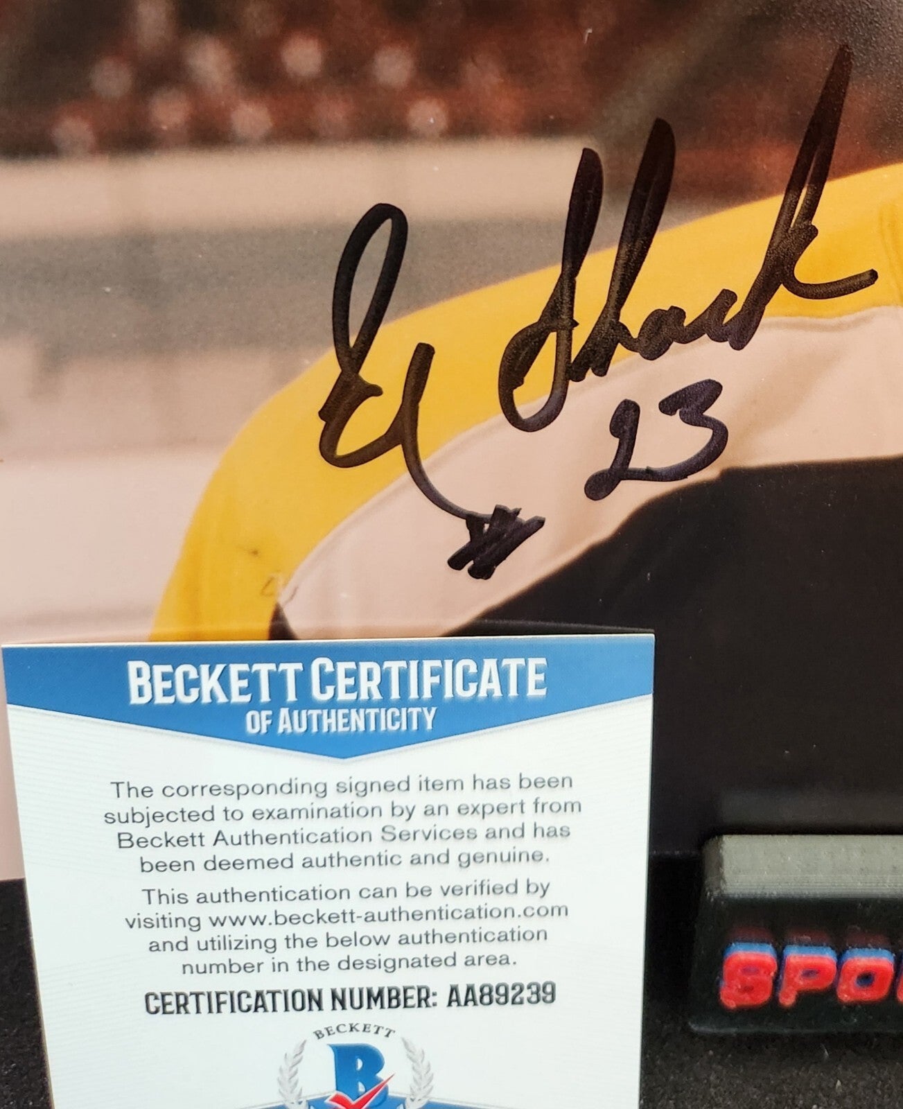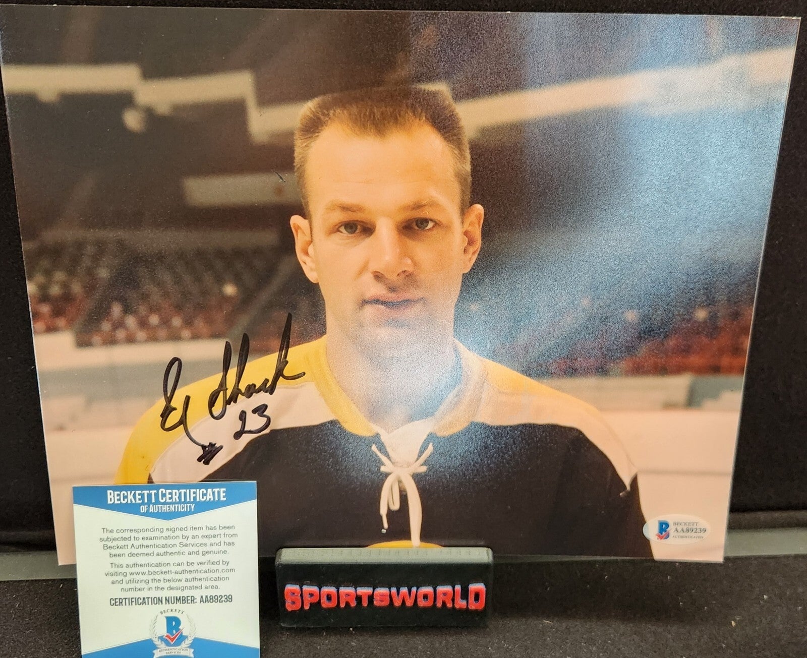 This 8x10 photo features Eddie Shack, a former NHL player who played for both the Boston Bruins and the Toronto Maple Leafs. The photo has been signed by Shack himself and comes with a Beckett Certificate of Authenticity to ensure its validity. It's a perfect addition to any hockey fan's collection, especially those who support the Boston Bruins. The item is original and ready to be displayed or stored as desired. Get this piece of hockey history today!