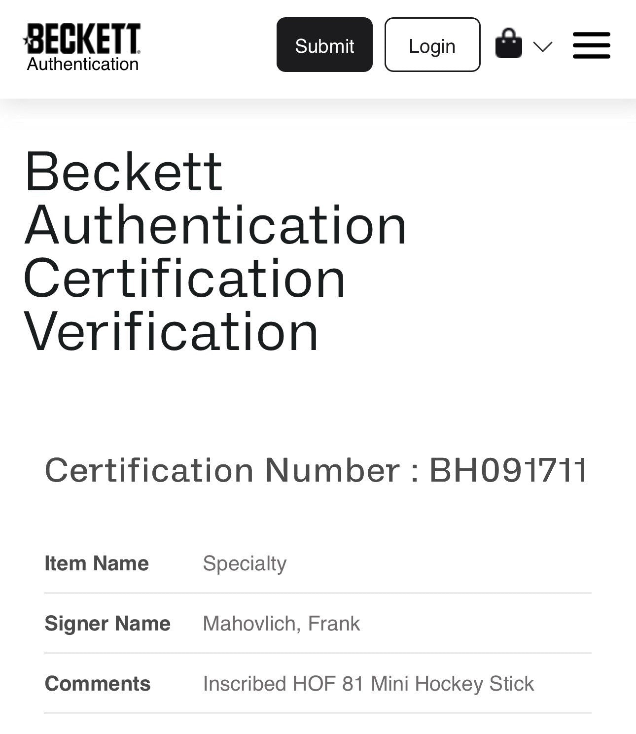Frank Mahovlich HOF 81 Signed Mini Stick Beckett Toronto Maple Leafs