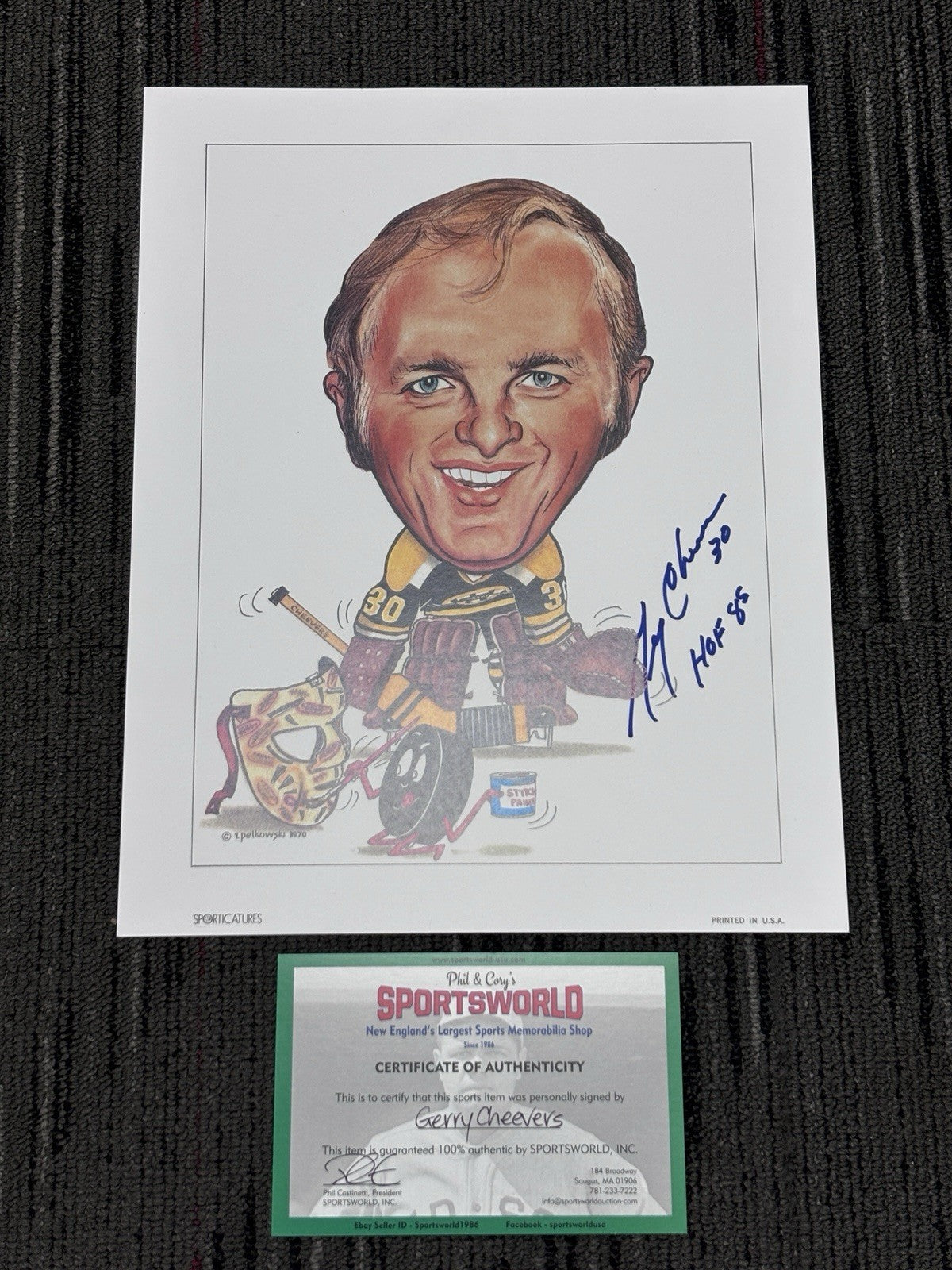 Gerry Cheevers 11x14 Signed HOF Inscription Sporticatures Print Sportsworld COA