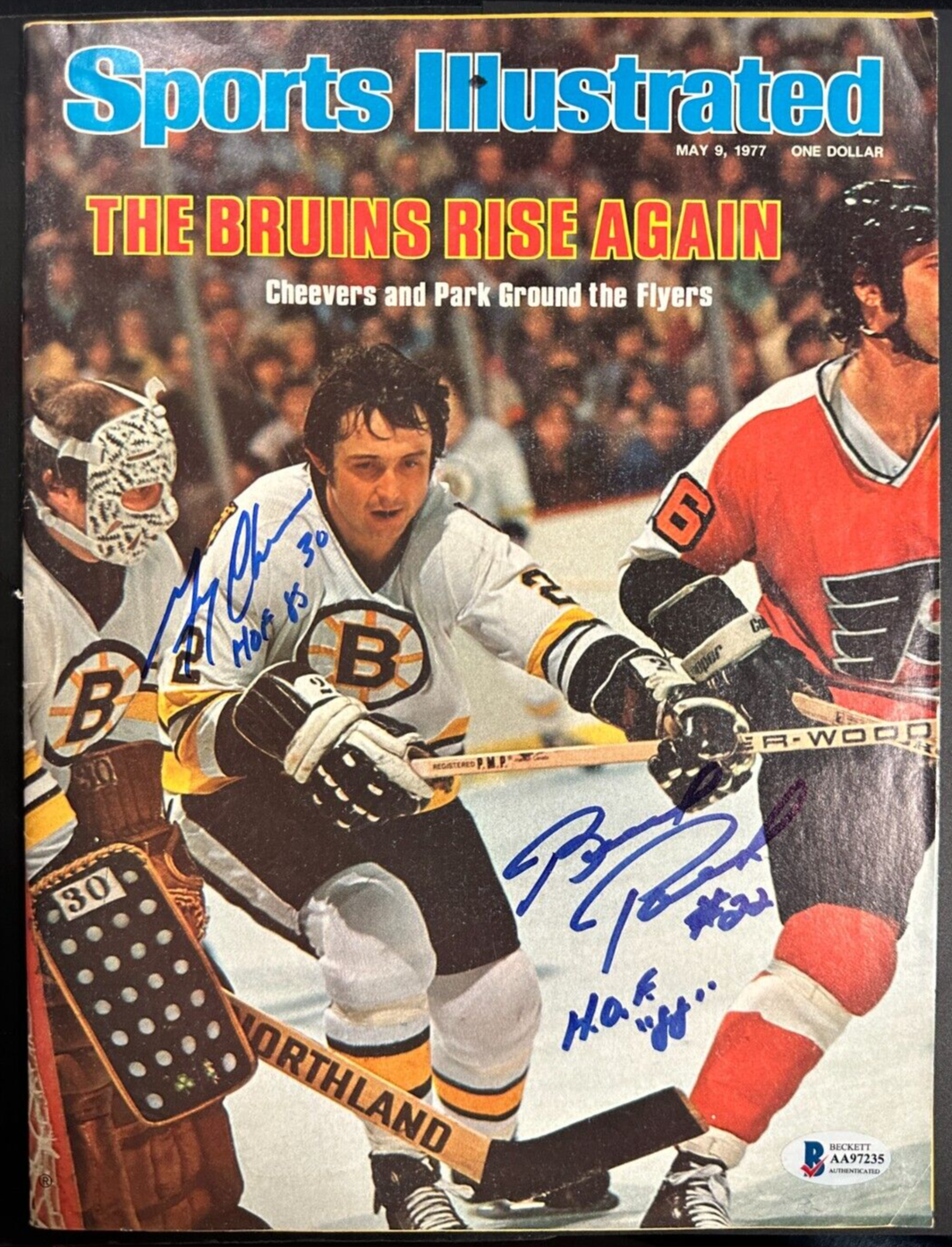 We're offering this May 9, 1977 Issue of the Sports Illustrated Autographed on the cover by Hockey Hall of Famers Brad Park & Gerry Cheevers of the Boston Bruins. It's in ex condition; it comes with a COA & Matching Hologram issued by BAS (AA97235) Beckett Authentication Services and the signatures are guaranteed to be 100% authentic. We will combine on shipping for similar items!
