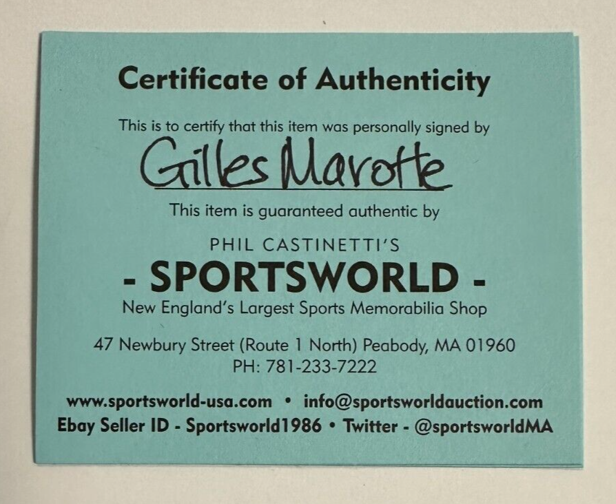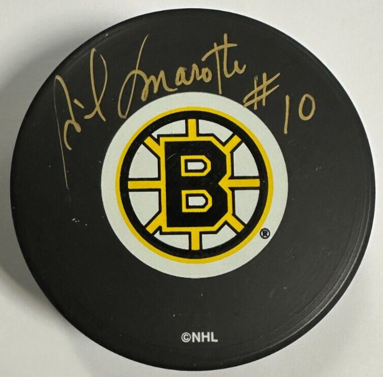 We're offering this Boston Bruins Hockey Puck Autographed by former Star Gilles Marotte. It's in nm-mt condition and it comes with a COA issued by Sportsworld, New England's Largest Sports Memorabilia Store and his signature is guaranteed to be 100% authentic. The puck will be shipped in a plastic display square.