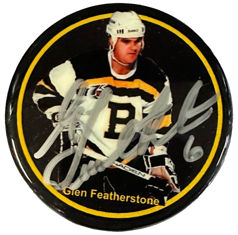 Glen Featherstone Autographed Boston Bruins Photo Puck NHL