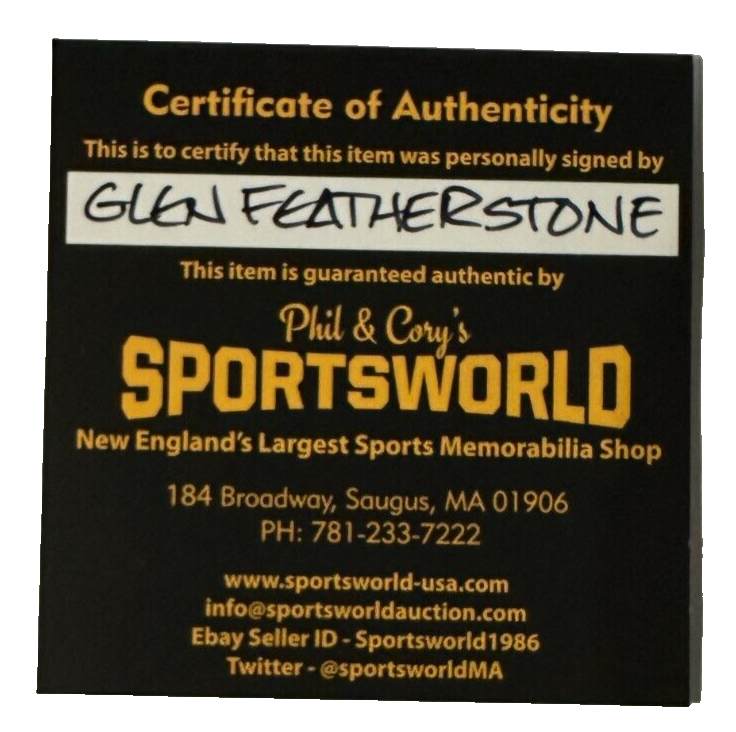 We're offering this Boston Bruins Photo Puck Autographed by former star Glen Featherstone. It's in nm condition and comes with a COA issued by Sportsworld, New England's Largest Sports Memorabilia Store and his signature is guaranteed to be 100% authentic. The puck will be shipped in a plastic display square, and we will combine shipping on similar items.