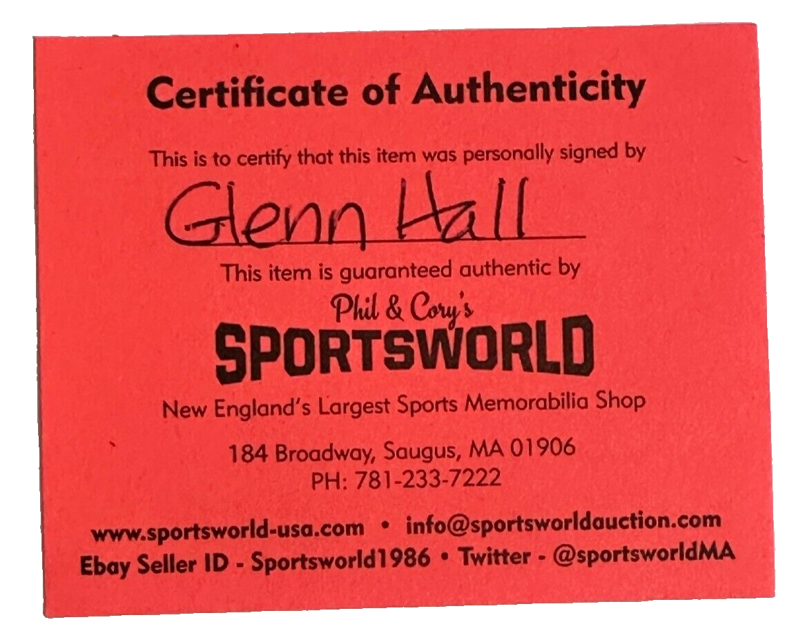 We're offering this Chicago Blackhawks Hockey Puck Autographed by Hockey Hall of Famer Glenn Hall. It's in nm condition and it comes with a COA issued by Sportsworld. New England's Largest Sports Memorabilia Store and his signature is guaranteed to be 100% authentic. It will be shipped in a plastic display square, and we will combine on shipping for similar items!