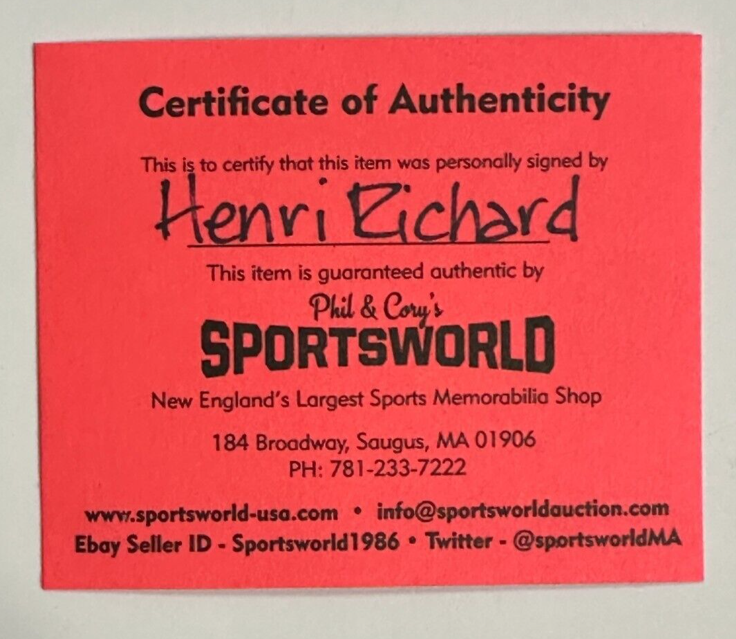 We're offering this Montreal Canadiens Hockey Puck Autographed by Hockey Hall of Famer Henri Richard. It's in nm condition and it comes with a COA issued by Sportsworld. New England's Largest Sports Memorabilia Store and his signature is guaranteed to be 100% authentic. It will be shipped in a plastic display square, and we will combine on shipping for similar items!