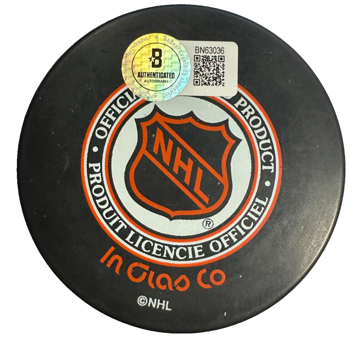 We're offering this Toronto Maple Leafs Hockey Puck Autographed & Inscribed with "HOF 98 & ROY 47/47" by Hockey Hall of Famer Howie Meeker. It's in nm condition and it comes with a Hologram Issued by BAS (BN63033) Beckett Authentication Services and his signature is guaranteed to be 100% authentic. It will be shipped in a plastic display square and, we will combine on shipping for similar items!
