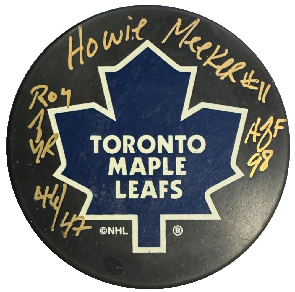 Howie Meeker Autographed Toronto Maple Leafs Puck W/ HOF 98 & ROY 46/47 BAS