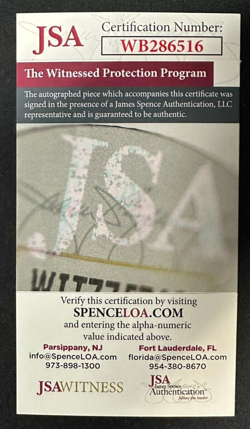 We're offering this Official New York Rangers Hockey Puck Autographed & Inscribed with "HOF 2001" by Hockey Hall of Famer Jari Kurri. It's in nm condition and it comes with a COA & Matching hologram Issued by JSA Authentication and his signature is guaranteed to be 100% authentic. The puck will be shipped in a plastic display square.