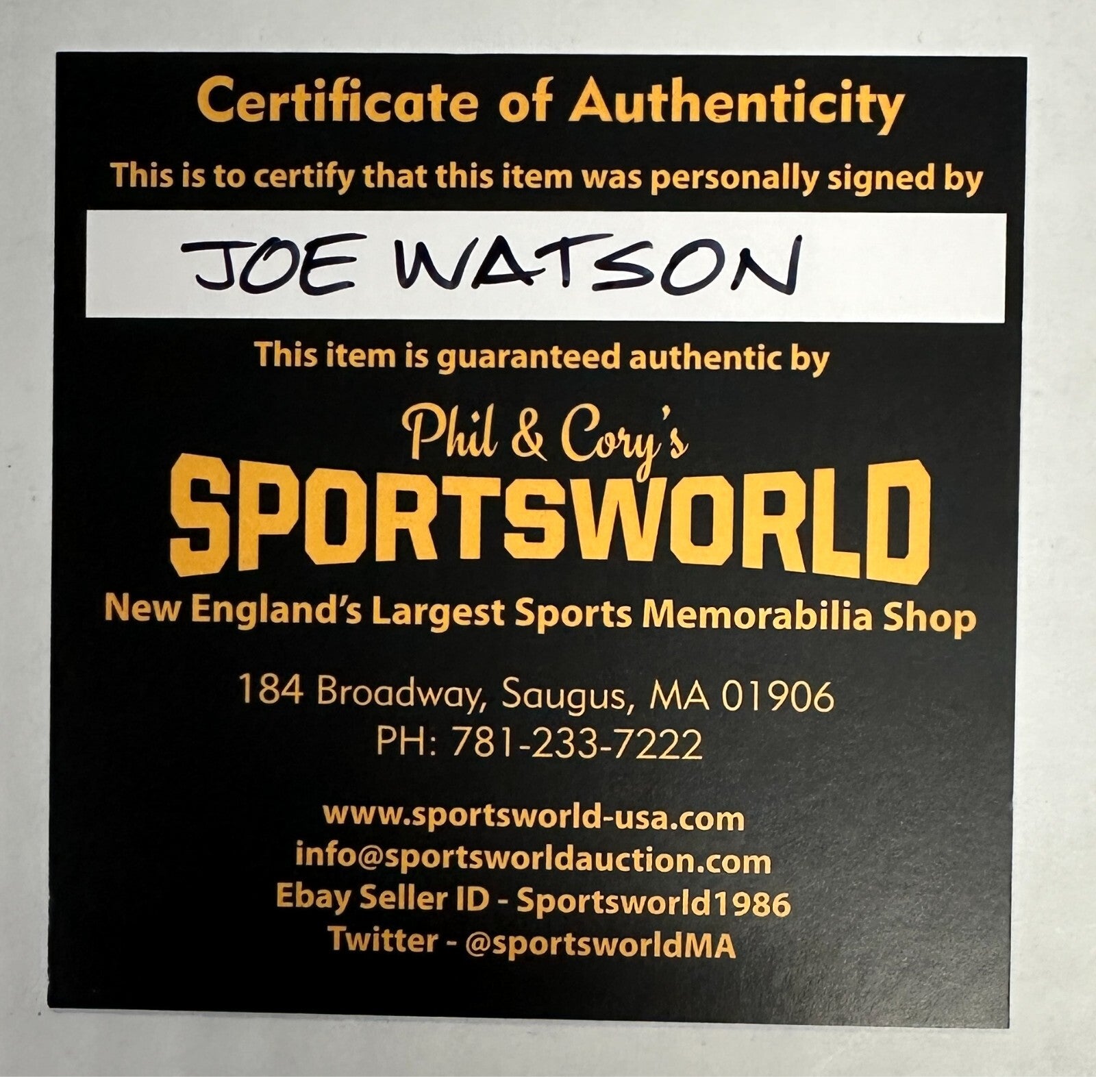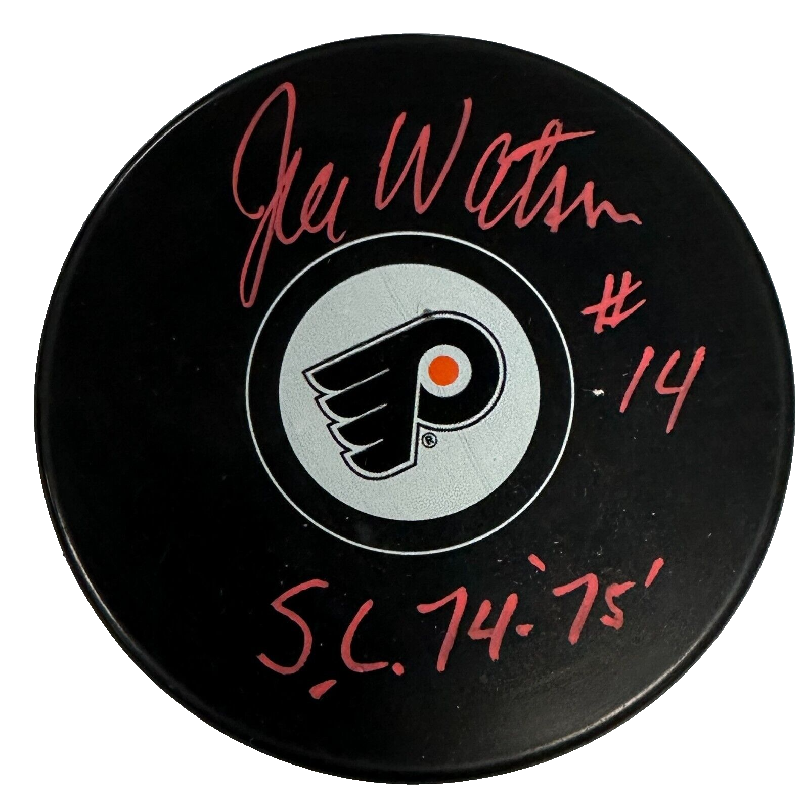 We're offering this Philadelphia Flyers Hockey Puck Autographed & Inscribed with "SC 74-75" by Joe Watson. It's in nm-mt condition and it comes with a COA Issued by Sportsworld New England's Largest Sports Memorabilia Store and his signature is guaranteed to be 100% authentic. The puck will be shipped in a plastic display square and, we will combine on shipping for similar items!