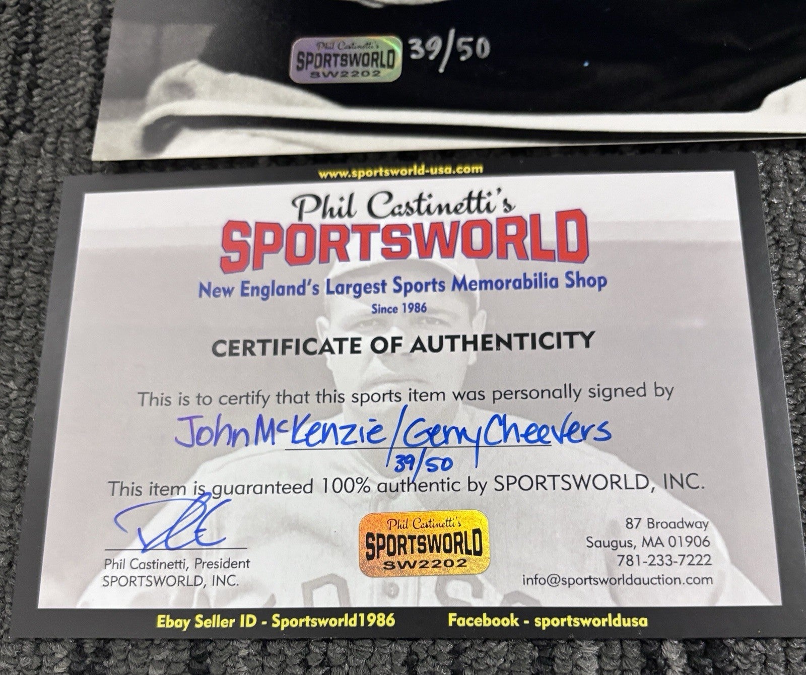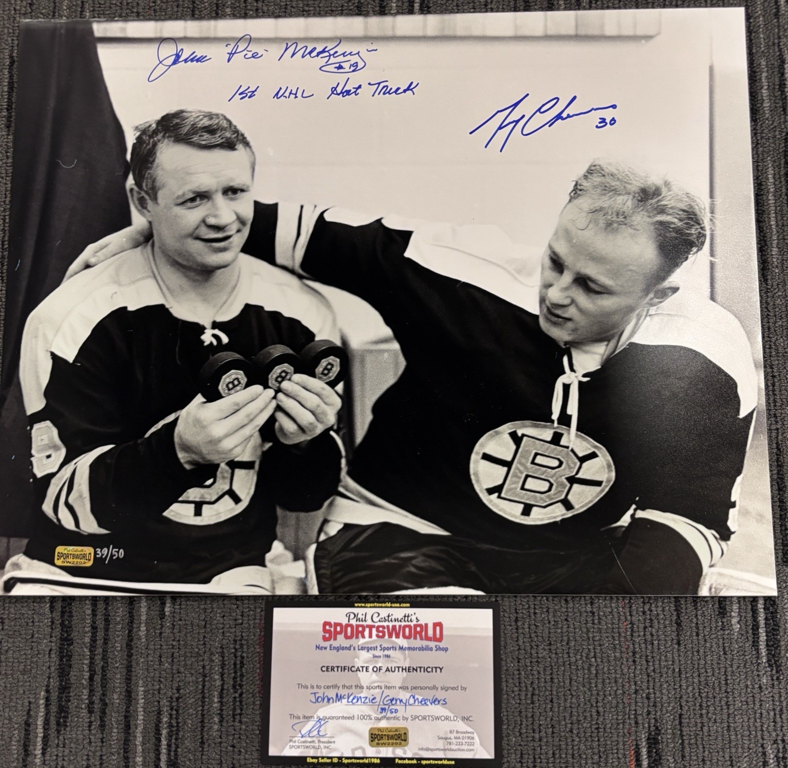 John McKenzie 1st Hat Trick Gerry Cheevers Signed 16x20 Sportsworld COA Bruins