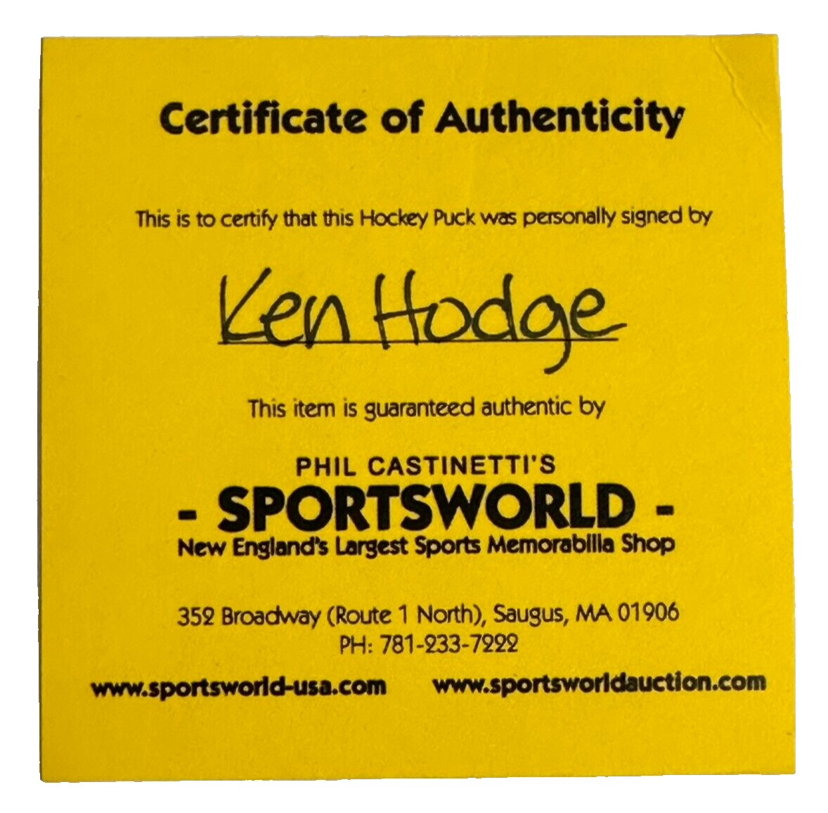 We're offering this Boston Bruins Hockey Puck Autographed by NHL All-Star Ken Hodge.It's in nm condition and it comes with a COA Issued by Sportsworld, New England's Largest Sports Memorabilia Shop and his signature is guaranteed to be 100% authentic. The puck was signed by Ken during a public signing at our store. We do have multiples of this puck, so the one you receive might not be the exact puck in the photo.