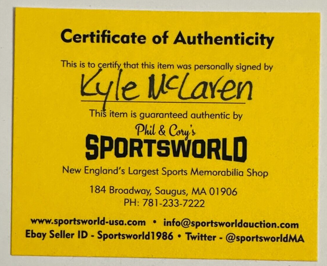 We're offering Official Boston Bruins 100th Anniversary Hockey Puck Autographed by former Bruins Defenseman Kyle McLaren. It's in nm condition and it comes with a COA Issued by Sportsworld, New England's Largest Sports Memorabilia Store and his signature is guaranteed to be 100% authentic. The puck will be shipped in a plastic display square and, we will combine on shipped for similar items.