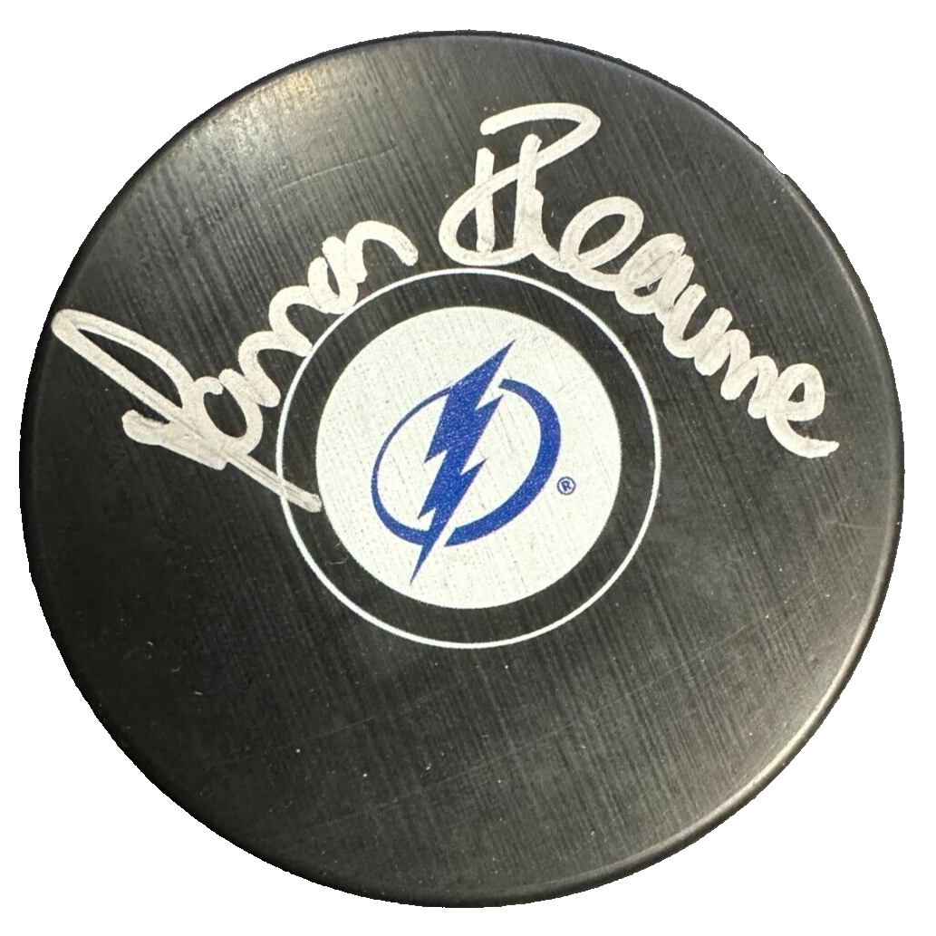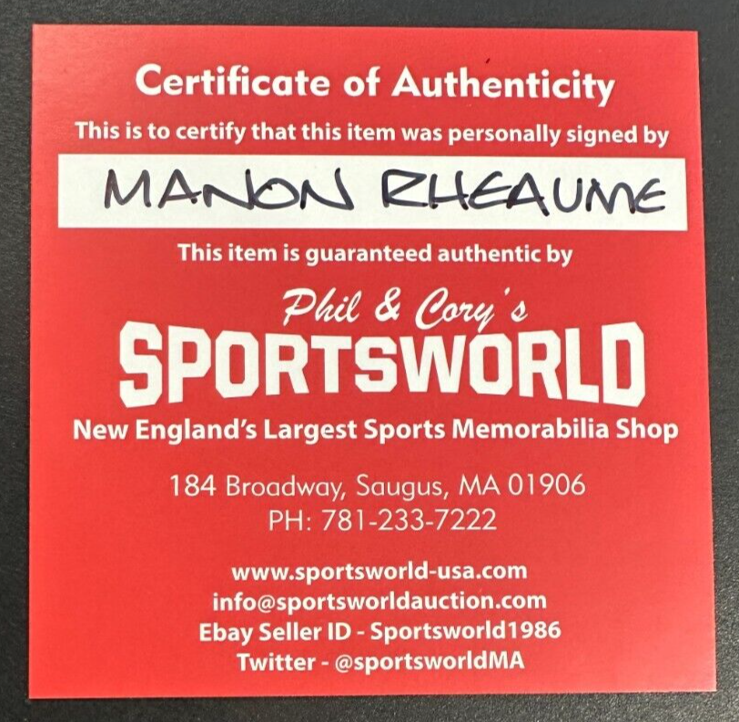We're offering this Tampa Bay Lightning Hockey Puck Autographed by Manon Rheaume of the Tampa Bay Lightning. It's in nm-mt condition. It comes with COA issued by Sportsworld New England's Largest Sports Memorabilia Store and her signature is guaranteed to be 100% authentic. It will be shipped in a plastic display square, and we will combine on shipping for similar items.