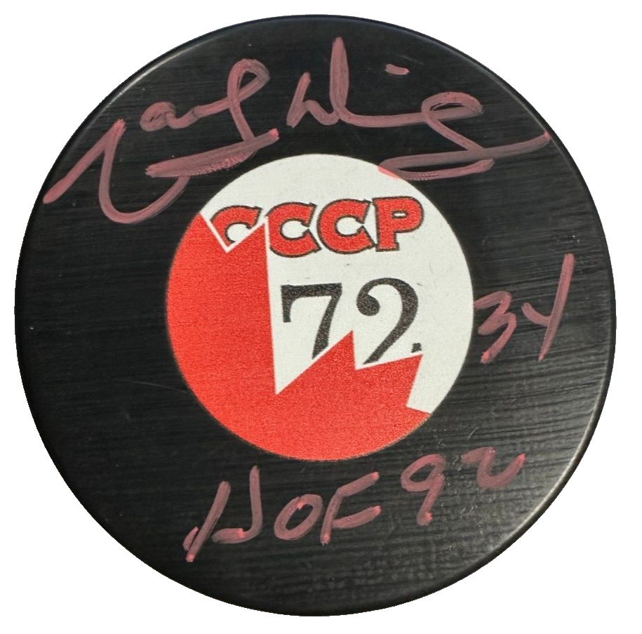 We're offering Official 1972 Canada Cup Summit Series Hockey Puck Autographed & Inscribed with "HOF 92" by Hockey Hall of Famer Marcel Dionne of the Los Angeles KingsIt's in ex condition and it comes with a COA Issued by Sportsworld, New England's Largest Sports Memorabilia Shop and his signature is guaranteed to be 100% authentic. The puck was signed by Marcel during a public signing at our store. We do have multiples of this puck signed by Marcel so the puck you receive might not be the exact puck in the photo. We will combine on shipping for similar items!