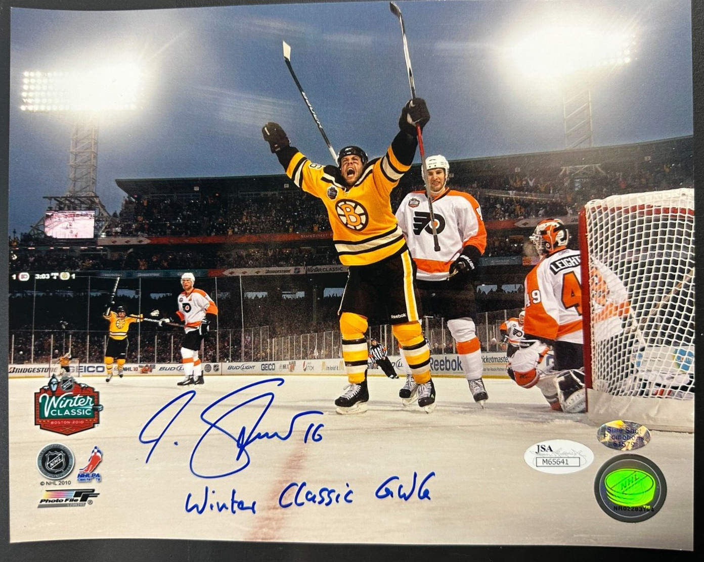 We're offering this Autographed 8x10 Photo of Boston Bruins Star Marco Sturm Celebrating his Game Winning Goal during the 2010 Winter Classic Hockey Game at Fenway Park in Boston. It comes with a COA & Matching Hologram issued by JSA Authentication (M65641), and his signature is guaranteed to be 100% authentic. The photo is in nm condition, and we will combine on shipping for similar items!