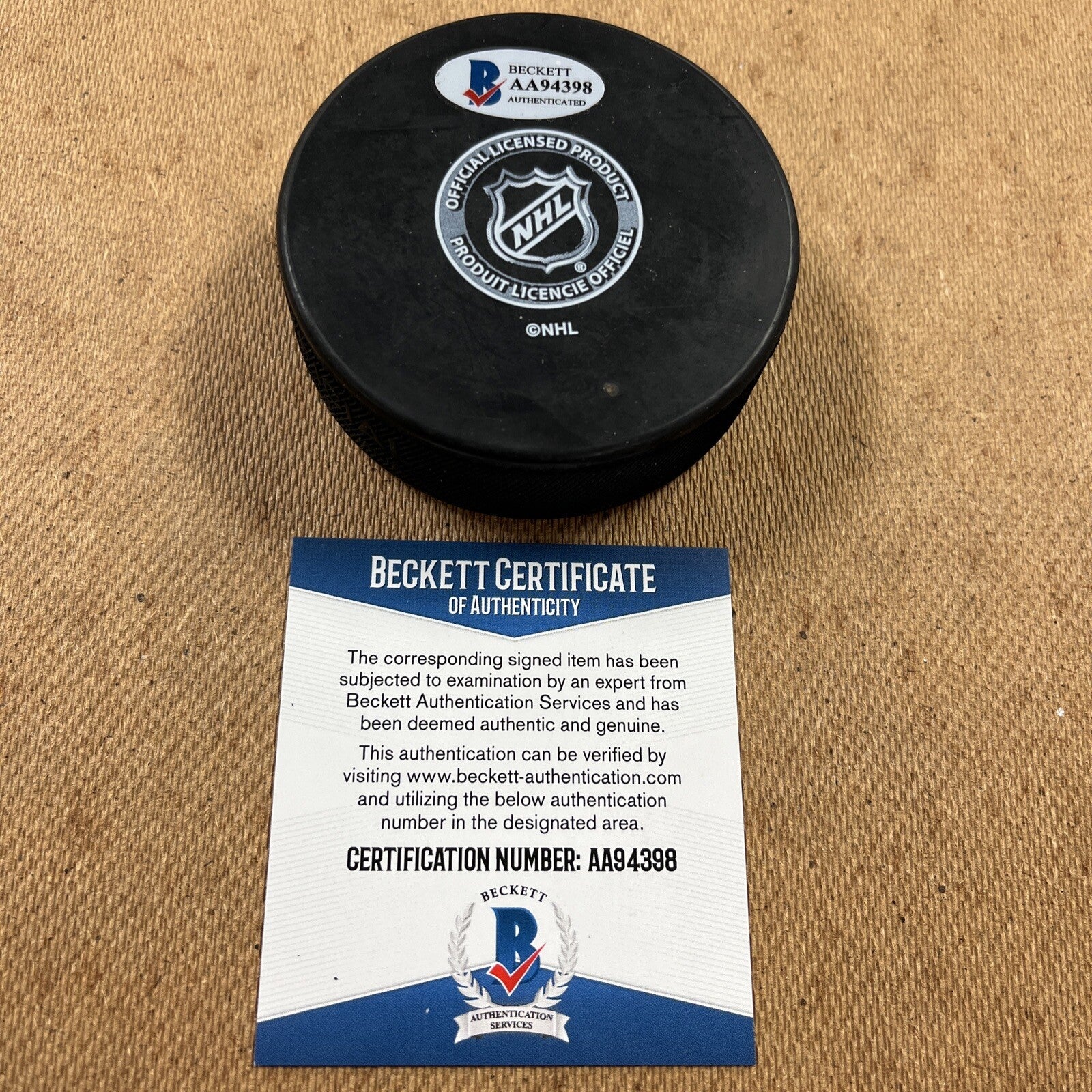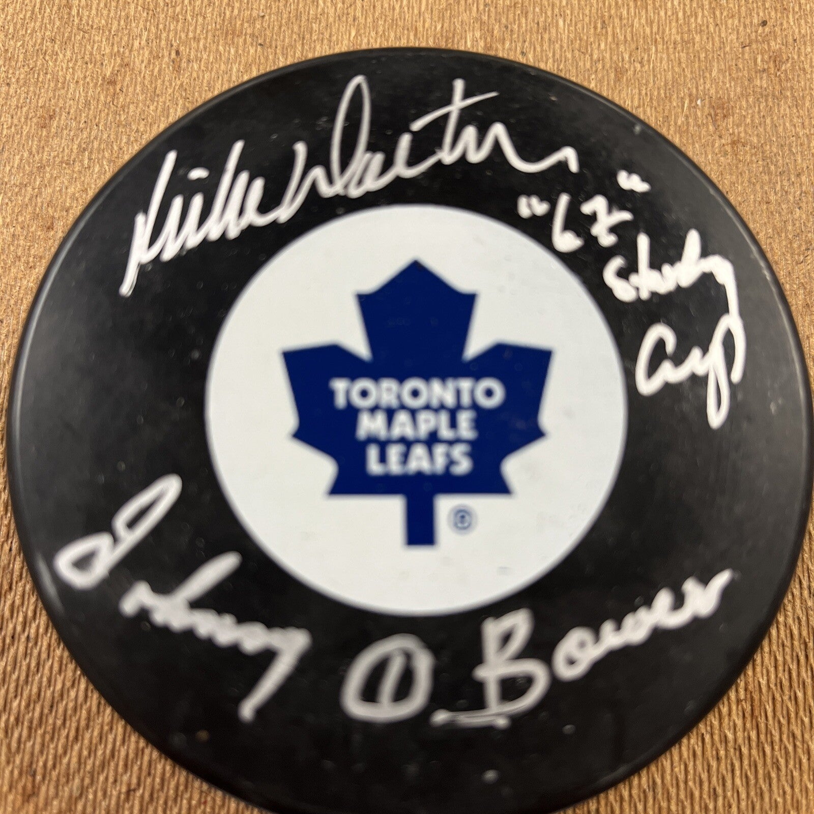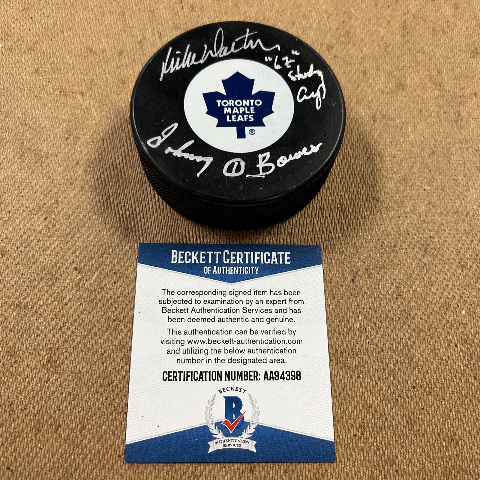 Mike Walton and Johnny Bower signed Puck 67 Stanley Cup inscribed with Beckett COA. Really nice puck will make a great addition to any Hockey collection.