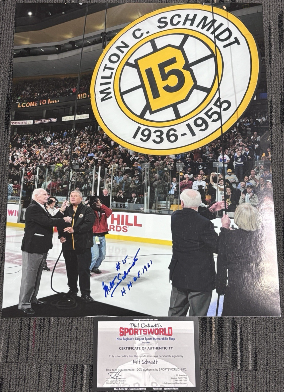 We're offering this 16x20 Photo Autographed by Hockey Hall of Famer Milt Schmidt of the Boston Bruins. It comes with a COA issued by Sportsworld New England's Largest Sports Memorabilia Store and his signature is guaranteed to be 100% authentic. The photo is in nm condition, and we will combine on shipping for similar items!