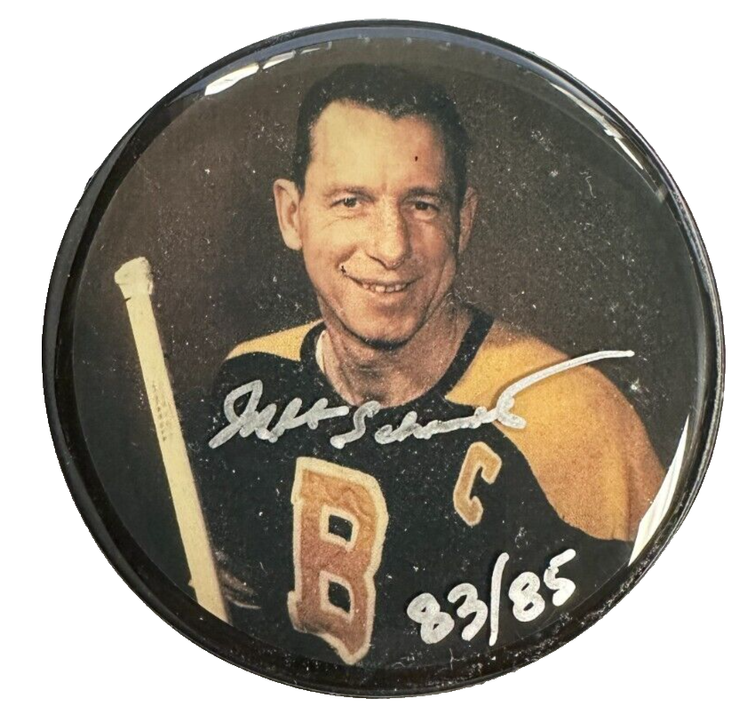 Milt Schmidt Autographed Boston Bruins Photo Puck HOF 83/85
