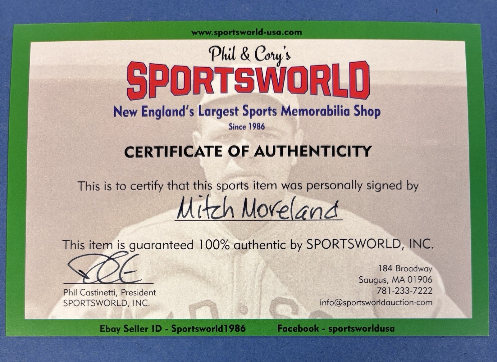 The product is a signed Rawlings Big Stick Model black bat by baseball player Mitch Moreland, who is associated with the Boston Red Sox. The autograph is authenticated by Sportsworld and the bat is an original piece, not a reprint. Made in the United States, this memorabilia item is perfect for fans of baseball and collectors of sports memorabilia.