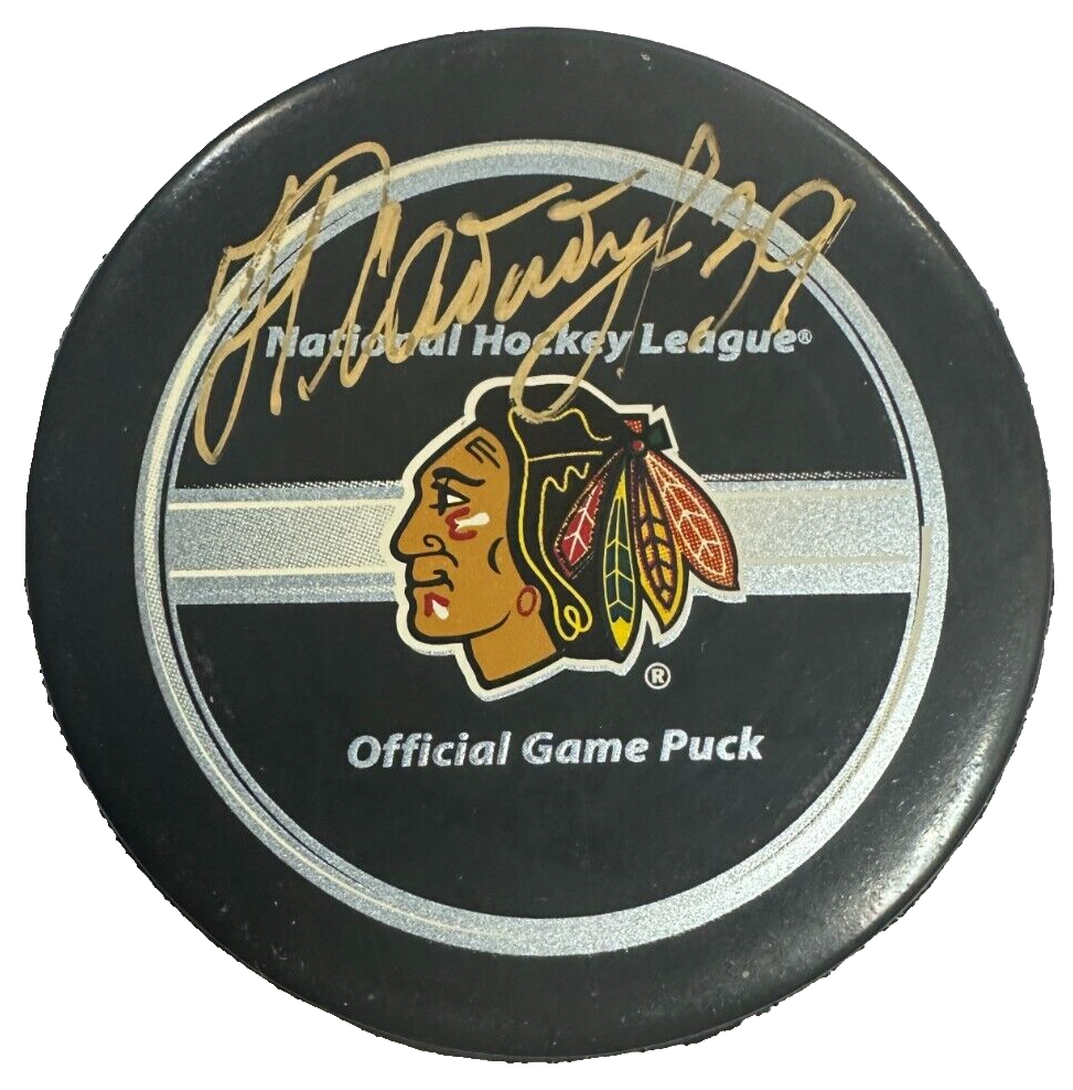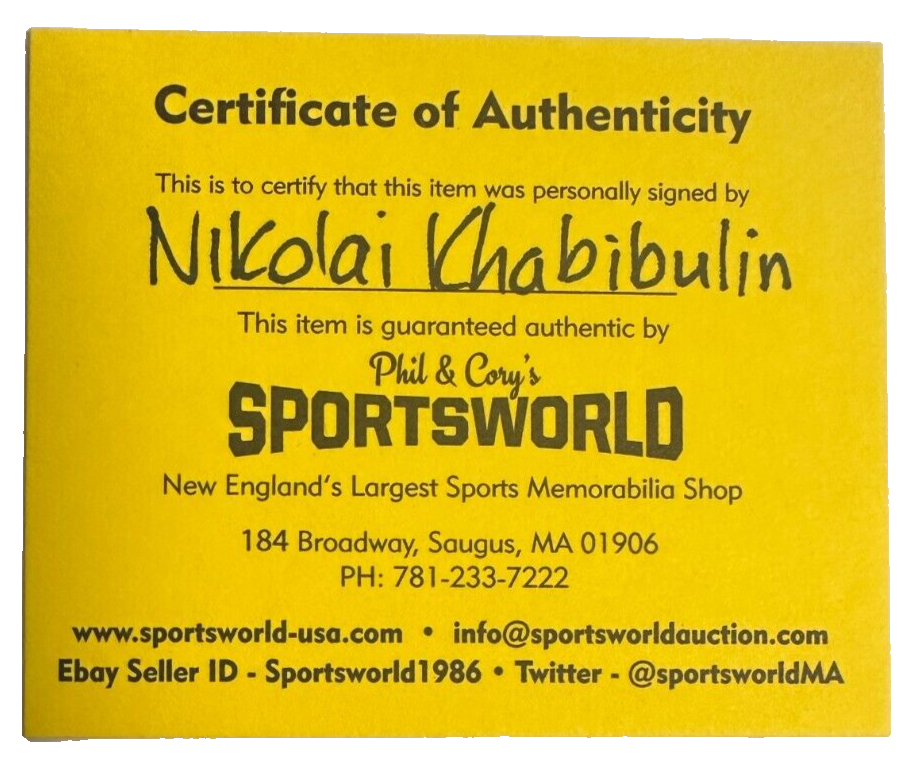 We're offering this Chicago Blackhawks Game Puck Autographed by former Goalie Nikolai Khabibulin. It's in nm condition and it comes with a COA Issued by Sportsworld, New England's Largest Sports Memorabilia Store and his signature is guaranteed to be 100% authentic. We do have multiple pucks signed by Nikolai so the puck that you receive might not be the exact puck in the photo. It will be shipped in a plastic display square, and we will combine on shipping for similar items!