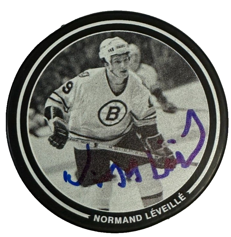 Normand Leveille Autographed Boston Bruins Photo Puck NHL