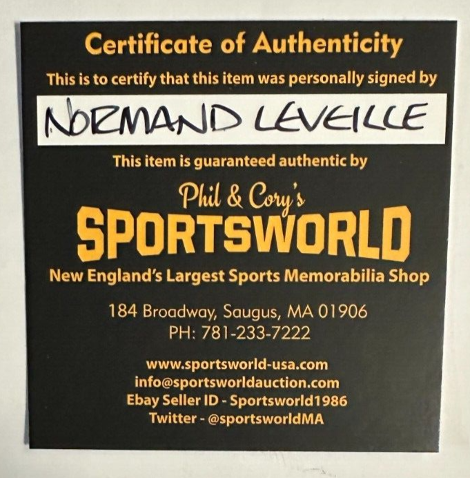 We're offering this Boston Bruins Photo Puck Autographed by former Star Normand Leveille. It's in nm-mt condition and it comes with a COA Issued by Sportsworld New England's Largest Sports Memorabilia Store and his signature is guaranteed to be 100% authentic. The puck will be shipped in a plastic display cube and, we will combine shipping for similar items